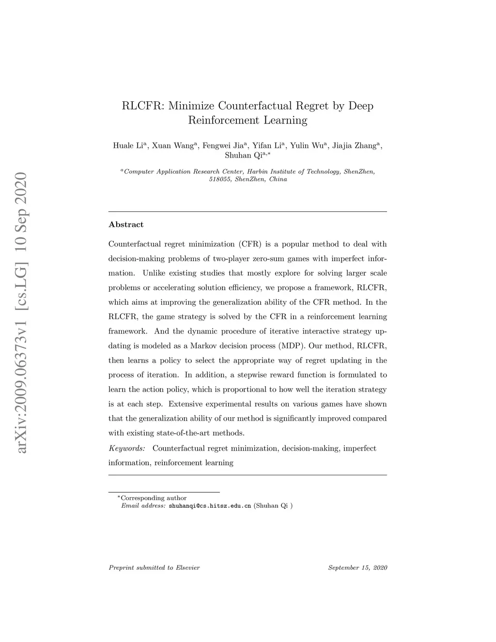 RLCFR: Minimize Counterfactual Regret by Deep Reinforcement Learning