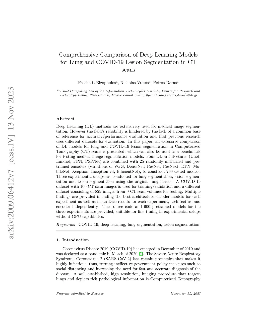 Recently there has been an explosion in the use of Deep Learning (DL) methods for medical image segmentation. However the field's reliability is hindered by the lack of a common base of reference for accuracy/performance evaluation and the fact that previous research uses different datasets for evaluation. In this paper, an extensive comparison of DL models for lung and COVID-19 lesion segmentation in Computerized Tomography (CT) scans is presented, which can also be used as a benchmark for testing medical image segmentation models. Four DL architectures (Unet, Linknet, FPN, PSPNet) are combined with 25 randomly initialized and pretrained encoders (variations of VGG, DenseNet, ResNet, ResNext, DPN, MobileNet, Xception, Inception-v4, EfficientNet), to construct 200 tested models. Three experimental setups are conducted for lung segmentation, lesion segmentation and lesion segmentation using the original lung masks. A public COVID-19 dataset with 100 CT scan images (80 for train, 20 for validation) is used for training/validation and a different public dataset consisting of 829 images from 9 CT scan volumes for testing. Multiple findings are provided including the best architecture-encoder models for each experiment as well as mean Dice results for each experiment, architecture and encoder independently. Finally, the upper bounds improvements when using lung masks as a preprocessing step or when using pretrained models are quantified. The source code and 600 pretrained models for the three experiments are provided, suitable for fine-tuning in experimental setups without GPU capabilities.