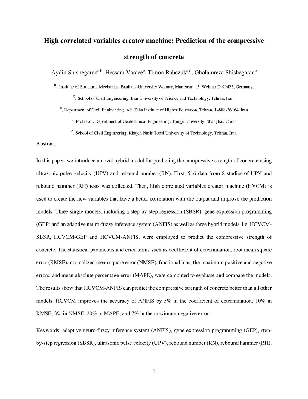 In this paper, we introduce a novel hybrid model for predicting the compressive strength of concrete using ultrasonic pulse velocity (UPV) and rebound number (RN). First, 516 data from 8 studies of UPV and rebound hammer (RH) tests was collected. Then, high correlated variables creator machine (HVCM) is used to create the new variables that have a better correlation with the output and improve the prediction models. Three single models, including a step-by-step regression (SBSR), gene expression programming (GEP) and an adaptive neuro-fuzzy inference system (ANFIS) as well as three hybrid models, i.e. HCVCM-SBSR, HCVCM-GEP and HCVCM-ANFIS, were employed to predict the compressive strength of concrete. The statistical parameters and error terms such as coefficient of determination, root mean square error (RMSE), normalized mean square error (NMSE), fractional bias, the maximum positive and negative errors, and mean absolute percentage error (MAPE), were computed to evaluate and compare the models. The results show that HCVCM-ANFIS can predict the compressive strength of concrete better than all other models. HCVCM improves the accuracy of ANFIS by 5% in the coefficient of determination, 10% in RMSE, 3% in NMSE, 20% in MAPE, and 7% in the maximum negative error.