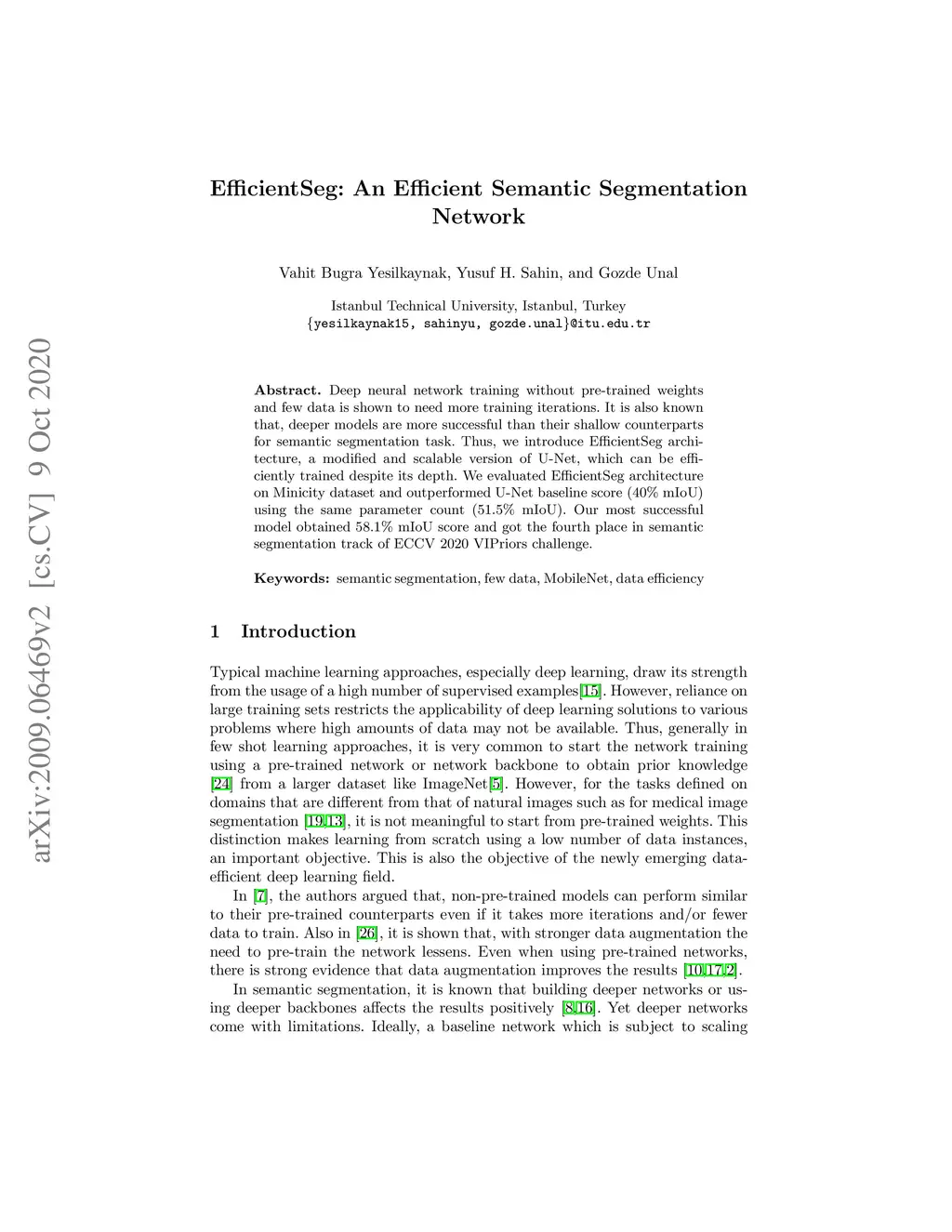 Deep neural network training without pre-trained weights and few data is shown to need more training iterations. It is also known that, deeper models are more successful than their shallow counterparts for semantic segmentation task. Thus, we introduce EfficientSeg architecture, a modified and scalable version of U-Net, which can be efficiently trained despite its depth. We evaluated EfficientSeg architecture on Minicity dataset and outperformed U-Net baseline score (40% mIoU) using the same parameter count (51.5% mIoU). Our most successful model obtained 58.1% mIoU score and got the fourth place in semantic segmentation track of ECCV 2020 VIPriors challenge.