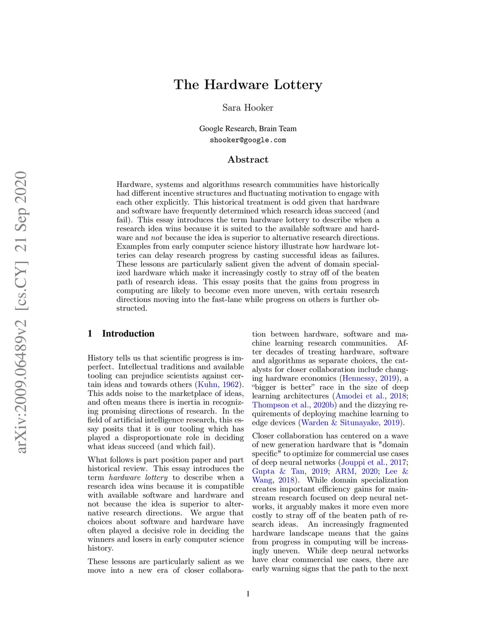 Hardware, systems and algorithms research communities have historically had different incentive structures and fluctuating motivation to engage with each other explicitly. This historical treatment is odd given that hardware and software have frequently determined which research ideas succeed (and fail). This essay introduces the term hardware lottery to describe when a research idea wins because it is suited to the available software and hardware and not because the idea is superior to alternative research directions. Examples from early computer science history illustrate how hardware lotteries can delay research progress by casting successful ideas as failures. These lessons are particularly salient given the advent of domain specialized hardware which make it increasingly costly to stray off of the beaten path of research ideas. This essay posits that the gains from progress in computing are likely to become even more uneven, with certain research directions moving into the fast-lane while progress on others is further obstructed.