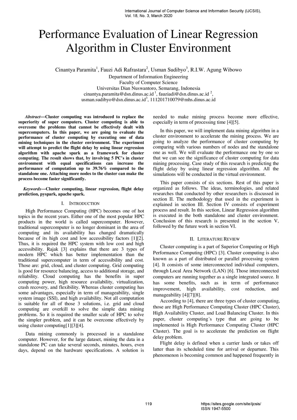 Cluster computing was introduced to replace the superiority of super computers. Cluster computing is able to overcome the problems that cannot be effectively dealt with supercomputers. In this paper, we are going to evaluate the performance of cluster computing by executing one of data mining techniques in the cluster environment. The experiment will attempt to predict the flight delay by using linear regression algorithm with apache spark as a framework for cluster computing. The result shows that, by involving 5 PCs in cluster environment with equal specifications can increase the performance of computation up to 39.76% compared to the standalone one. Attaching more nodes to the cluster can make the process become faster significantly.