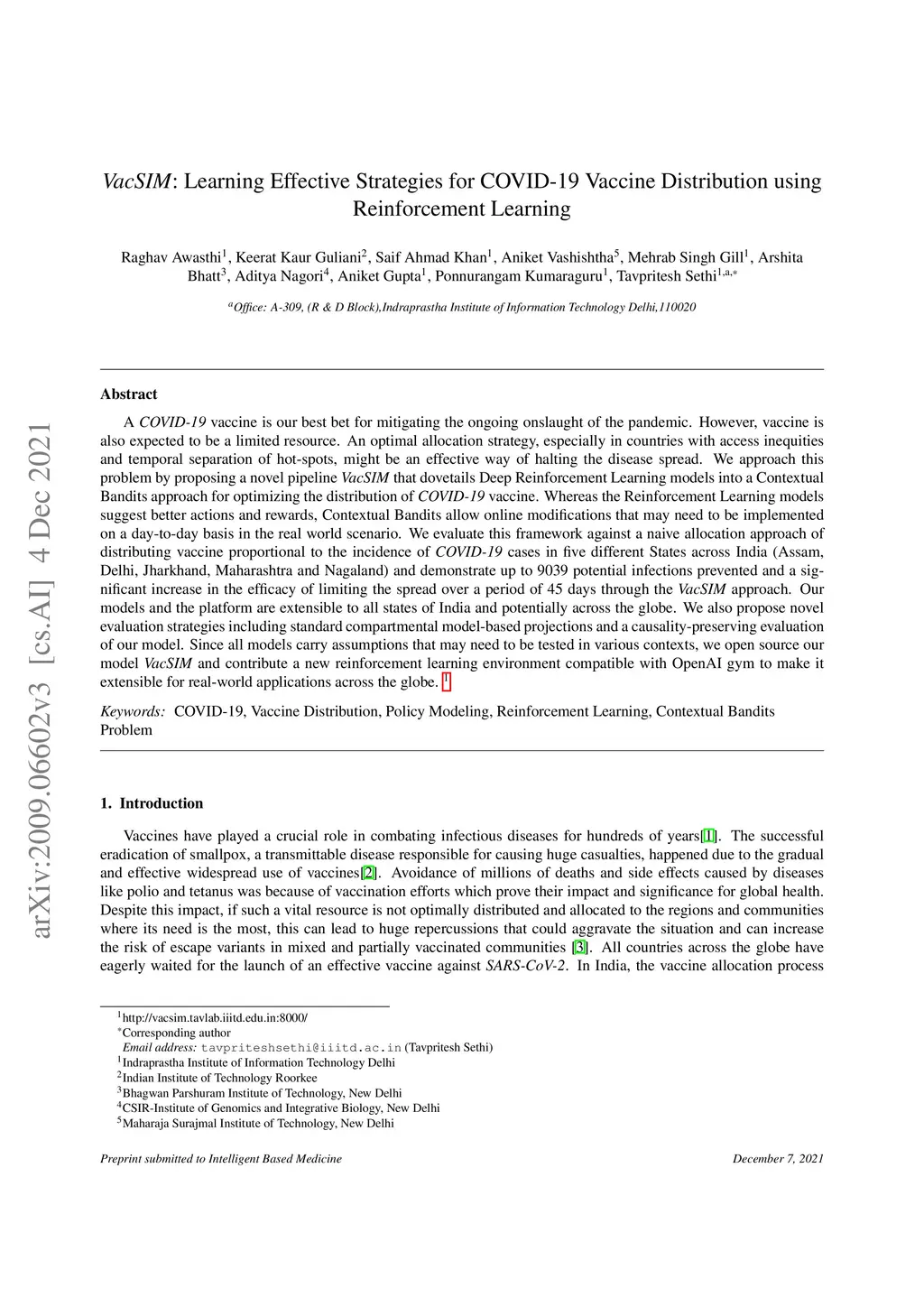 A COVID-19 vaccine is our best bet for mitigating the ongoing onslaught of the pandemic. However, vaccine is also expected to be a limited resource. An optimal allocation strategy, especially in countries with access inequities and temporal separation of hot-spots, might be an effective way of halting the disease spread. We approach this problem by proposing a novel pipeline VacSIM that dovetails Deep Reinforcement Learning models into a Contextual Bandits approach for optimizing the distribution of COVID-19 vaccine. Whereas the Reinforcement Learning models suggest better actions and rewards, Contextual Bandits allow online modifications that may need to be implemented on a day-to-day basis in the real world scenario. We evaluate this framework against a naive allocation approach of distributing vaccine proportional to the incidence of COVID-19 cases in five different States across India (Assam, Delhi, Jharkhand, Maharashtra and Nagaland) and demonstrate up to 9039 potential infections prevented and a significant increase in the efficacy of limiting the spread over a period of 45 days through the VacSIM approach. Our models and the platform are extensible to all states of India and potentially across the globe. We also propose novel evaluation strategies including standard compartmental model-based projections and a causality-preserving evaluation of our model. Since all models carry assumptions that may need to be tested in various contexts, we open source our model VacSIM and contribute a new reinforcement learning environment compatible with OpenAI gym to make it extensible for real-world applications across the globe. (http://vacsim.tavlab.iiitd.edu.in:8000/).