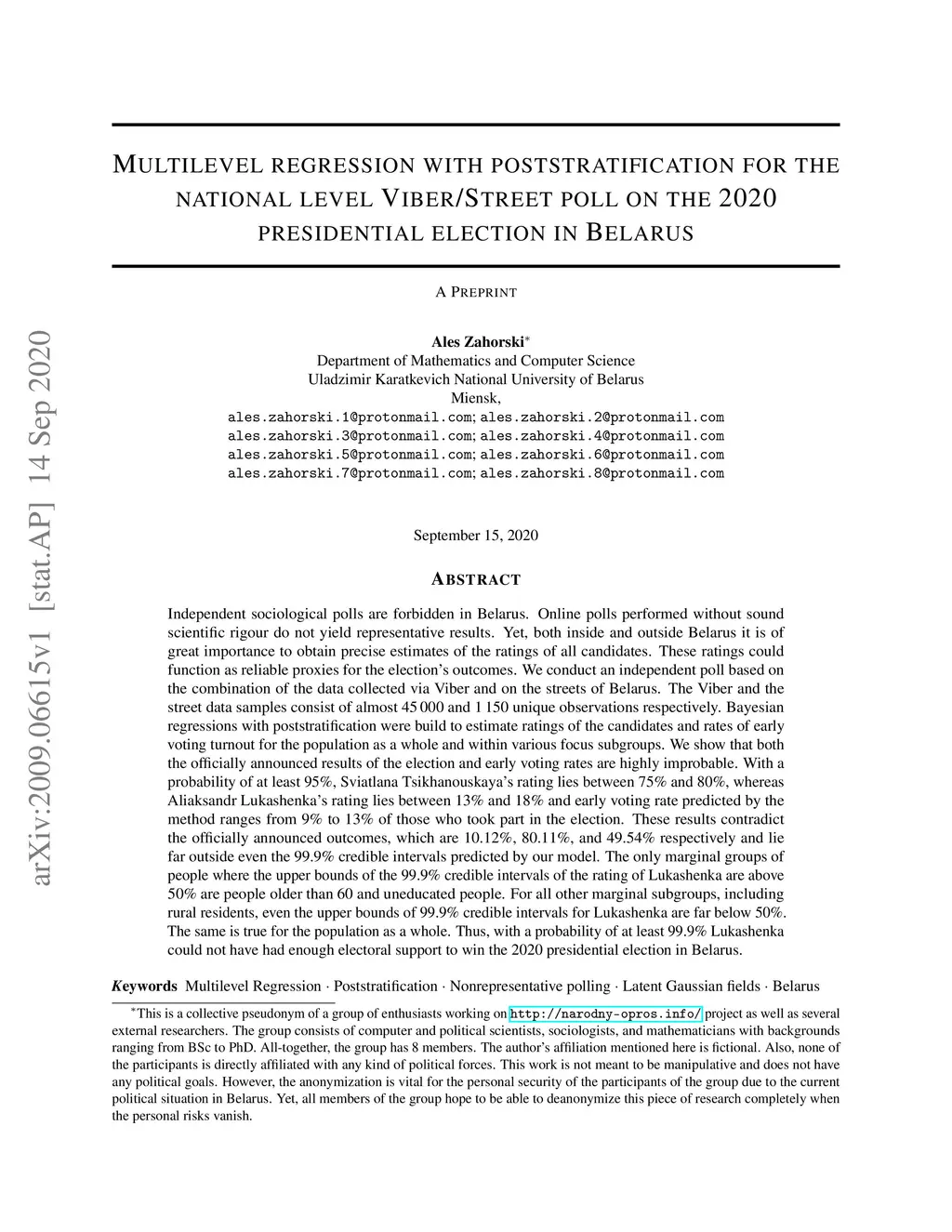 Independent sociological polls are forbidden in Belarus. Online polls performed without sound scientific rigour do not yield representative results. Yet, both inside and outside Belarus it is of great importance to obtain precise estimates of the ratings of all candidates. These ratings could function as reliable proxies for the election's outcomes. We conduct an independent poll based on the combination of the data collected via Viber and on the streets of Belarus. The Viber and the street data samples consist of almost 45000 and 1150 unique observations respectively. Bayesian regressions with poststratification were build to estimate ratings of the candidates and rates of early voting turnout for the population as a whole and within various focus subgroups. We show that both the officially announced results of the election and early voting rates are highly improbable. With a probability of at least 95%, Sviatlana Tikhanouskaya's rating lies between 75% and 80%, whereas Aliaksandr Lukashenka's rating lies between 13% and 18% and early voting rate predicted by the method ranges from 9% to 13% of those who took part in the election. These results contradict the officially announced outcomes, which are 10.12%, 80.11%, and 49.54% respectively and lie far outside even the 99.9% credible intervals predicted by our model. The only marginal groups of people where the upper bounds of the 99.9% credible intervals of the rating of Lukashenka are above 50% are people older than 60 and uneducated people. For all other marginal subgroups, including rural residents, even the upper bounds of 99.9% credible intervals for Lukashenka are far below 50%. The same is true for the population as a whole. Thus, with a probability of at least 99.9% Lukashenka could not have had enough electoral support to win the 2020 presidential election in Belarus.