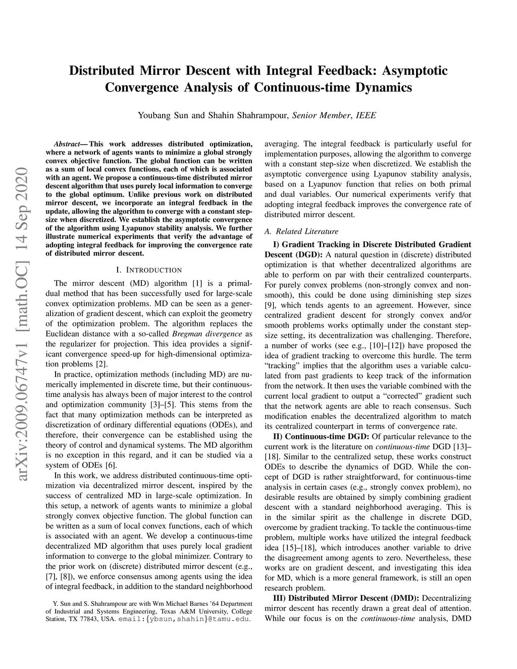 Distributed Mirror Descent with Integral Feedback: Asymptotic