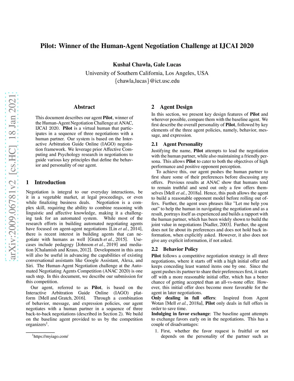 This document describes our agent Pilot, winner of the Human-Agent Negotiation Challenge at ANAC, IJCAI 2020. Pilot is a virtual human that participates in a sequence of three negotiations with a human partner. Our system is based on the Interactive Arbitration Guide Online (IAGO) negotiation framework. We leverage prior Affective Computing and Psychology research in negotiations to guide various key principles that define the behavior and personality of our agent.