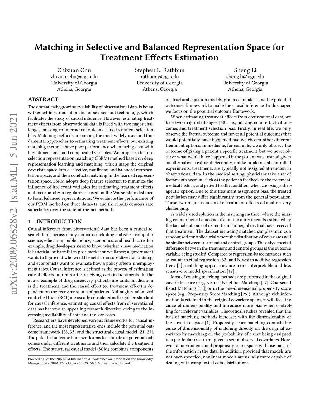 The dramatically growing availability of observational data is being witnessed in various domains of science and technology, which facilitates the study of causal inference. However, estimating treatment effects from observational data is faced with two major challenges, missing counterfactual outcomes and treatment selection bias. Matching methods are among the most widely used and fundamental approaches to estimating treatment effects, but existing matching methods have poor performance when facing data with high dimensional and complicated variables. We propose a feature selection representation matching (FSRM) method based on deep representation learning and matching, which maps the original covariate space into a selective, nonlinear, and balanced representation space, and then conducts matching in the learned representation space. FSRM adopts deep feature selection to minimize the influence of irrelevant variables for estimating treatment effects and incorporates a regularizer based on the Wasserstein distance to learn balanced representations. We evaluate the performance of our FSRM method on three datasets, and the results demonstrate superiority over the state-of-the-art methods.