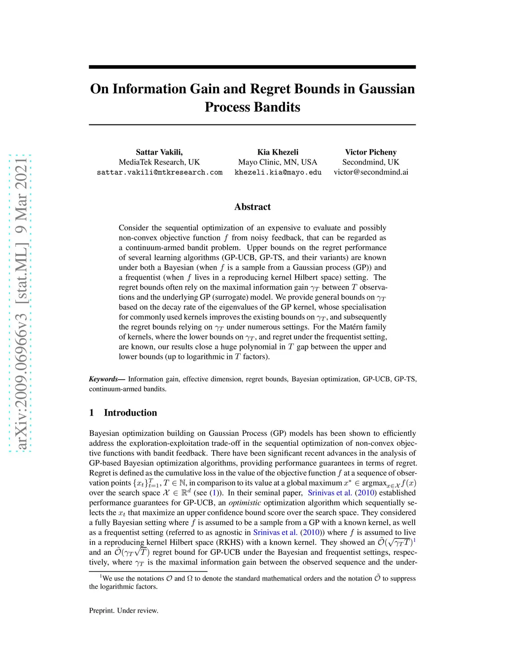 Consider the sequential optimization of an expensive to evaluate and possibly non-convex objective function from noisy feedback, that can be considered as a continuum-armed bandit problem. Upper bounds on the regret performance of several learning algorithms (GP-UCB, GP-TS, and their variants) are known under both a Bayesian (when is a sample from a Gaussian process (GP)) and a frequentist (when lives in a reproducing kernel Hilbert space) setting. The regret bounds often rely on the maximal information gain between observations and the underlying GP (surrogate) model. We provide general bounds on based on the decay rate of the eigenvalues of the GP kernel, whose specialisation for commonly used kernels, improves the existing bounds on , and consequently the regret bounds relying on under numerous settings. For the Mat\'ern family of kernels, where the lower bounds on , and regret under the frequentist setting, are known, our results close a huge polynomial in gap between the upper and lower bounds (up to logarithmic in factors).
