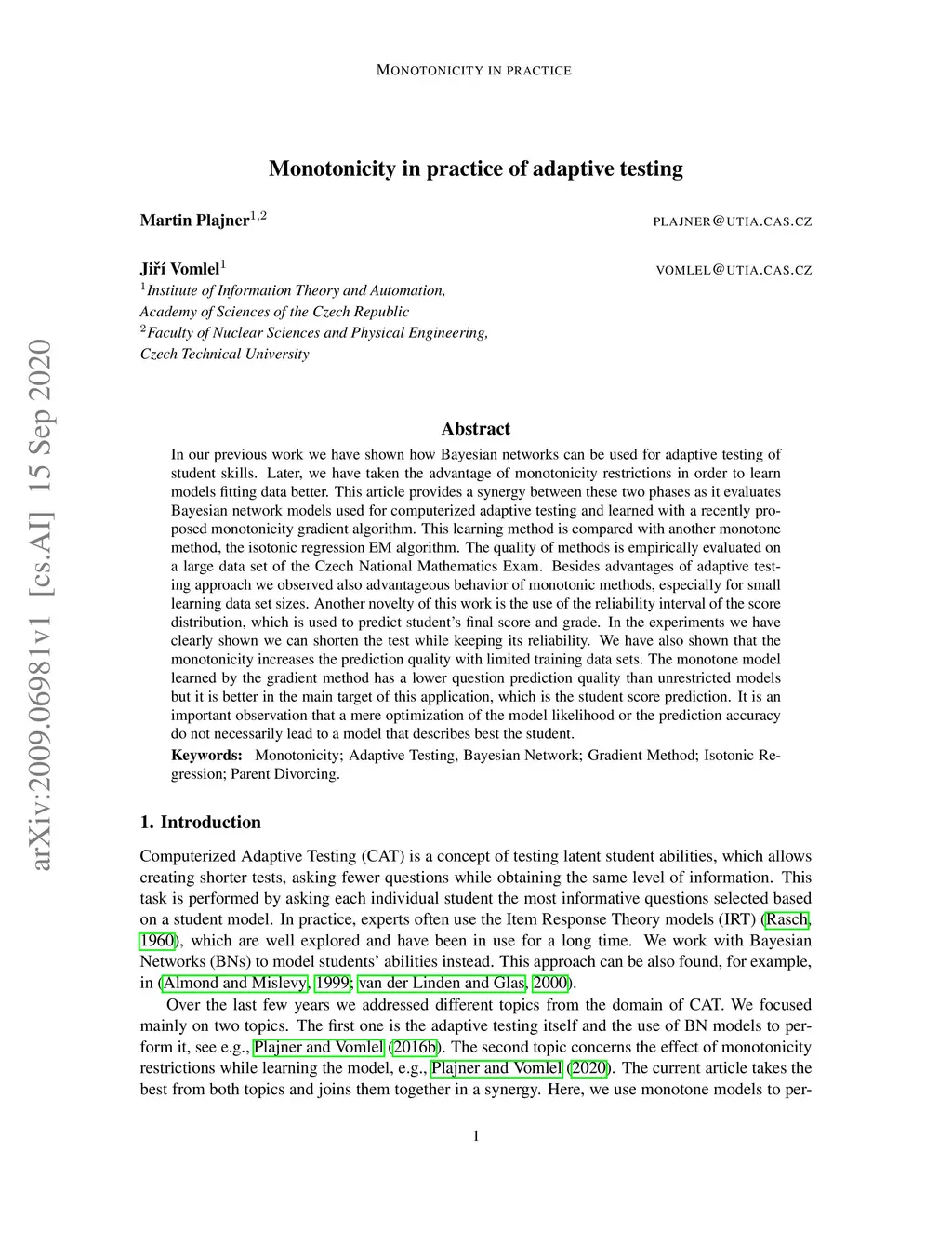 In our previous work we have shown how Bayesian networks can be used for adaptive testing of student skills. Later, we have taken the advantage of monotonicity restrictions in order to learn models fitting data better. This article provides a synergy between these two phases as it evaluates Bayesian network models used for computerized adaptive testing and learned with a recently proposed monotonicity gradient algorithm. This learning method is compared with another monotone method, the isotonic regression EM algorithm. The quality of methods is empirically evaluated on a large data set of the Czech National Mathematics Exam. Besides advantages of adaptive testing approach we observed also advantageous behavior of monotonic methods, especially for small learning data set sizes. Another novelty of this work is the use of the reliability interval of the score distribution, which is used to predict student's final score and grade. In the experiments we have clearly shown we can shorten the test while keeping its reliability. We have also shown that the monotonicity increases the prediction quality with limited training data sets. The monotone model learned by the gradient method has a lower question prediction quality than unrestricted models but it is better in the main target of this application, which is the student score prediction. It is an important observation that a mere optimization of the model likelihood or the prediction accuracy do not necessarily lead to a model that describes best the student.