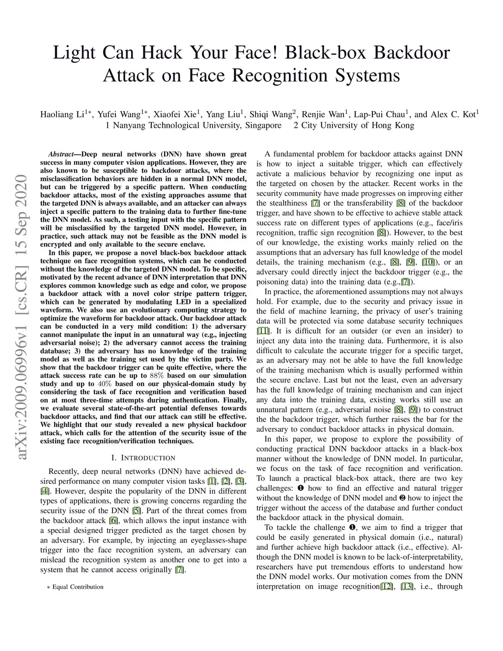 Deep neural networks (DNN) have shown great success in many computer vision applications. However, they are also known to be susceptible to backdoor attacks. When conducting backdoor attacks, most of the existing approaches assume that the targeted DNN is always available, and an attacker can always inject a specific pattern to the training data to further fine-tune the DNN model. However, in practice, such attack may not be feasible as the DNN model is encrypted and only available to the secure enclave. In this paper, we propose a novel black-box backdoor attack technique on face recognition systems, which can be conducted without the knowledge of the targeted DNN model. To be specific, we propose a backdoor attack with a novel color stripe pattern trigger, which can be generated by modulating LED in a specialized waveform. We also use an evolutionary computing strategy to optimize the waveform for backdoor attack. Our backdoor attack can be conducted in a very mild condition: 1) the adversary cannot manipulate the input in an unnatural way (e.g., injecting adversarial noise); 2) the adversary cannot access the training database; 3) the adversary has no knowledge of the training model as well as the training set used by the victim party. We show that the backdoor trigger can be quite effective, where the attack success rate can be up to based on our simulation study and up to based on our physical-domain study by considering the task of face recognition and verification based on at most three-time attempts during authentication. Finally, we evaluate several state-of-the-art potential defenses towards backdoor attacks, and find that our attack can still be effective. We highlight that our study revealed a new physical backdoor attack, which calls for the attention of the security issue of the existing face recognition/verification techniques.