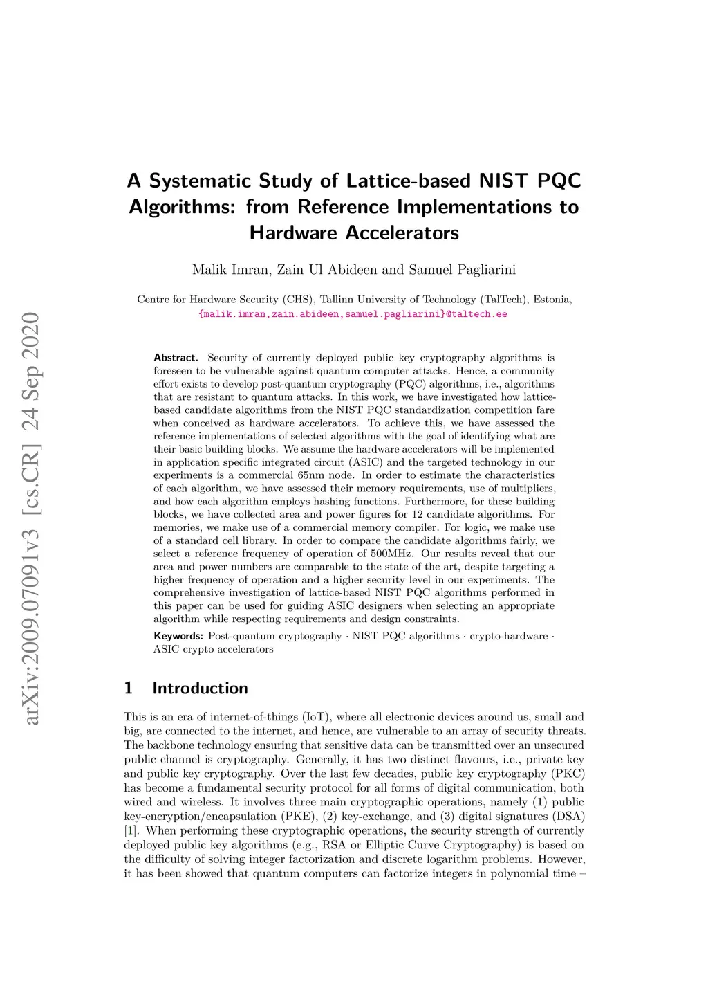 Security of currently deployed public key cryptography algorithms is foreseen to be vulnerable against quantum computer attacks. Hence, a community effort exists to develop post-quantum cryptography (PQC) algorithms, i.e., algorithms that are resistant to quantum attacks. In this work, we have investigated how lattice-based candidate algorithms from the NIST PQC standardization competition fare when conceived as hardware accelerators. To achieve this, we have assessed the reference implementations of selected algorithms with the goal of identifying what are their basic building blocks. We assume the hardware accelerators will be implemented in application specific integrated circuit (ASIC) and the targeted technology in our experiments is a commercial 65nm node. In order to estimate the characteristics of each algorithm, we have assessed their memory requirements, use of multipliers, and how each algorithm employs hashing functions. Furthermore, for these building blocks, we have collected area and power figures for 12 candidate algorithms. For memories, we make use of a commercial memory compiler. For logic, we make use of a standard cell library. In order to compare the candidate algorithms fairly, we select a reference frequency of operation of 500MHz. Our results reveal that our area and power numbers are comparable to the state of the art, despite targeting a higher frequency of operation and a higher security level in our experiments. The comprehensive investigation of lattice-based NIST PQC algorithms performed in this paper can be used for guiding ASIC designers when selecting an appropriate algorithm while respecting requirements and design constraints.