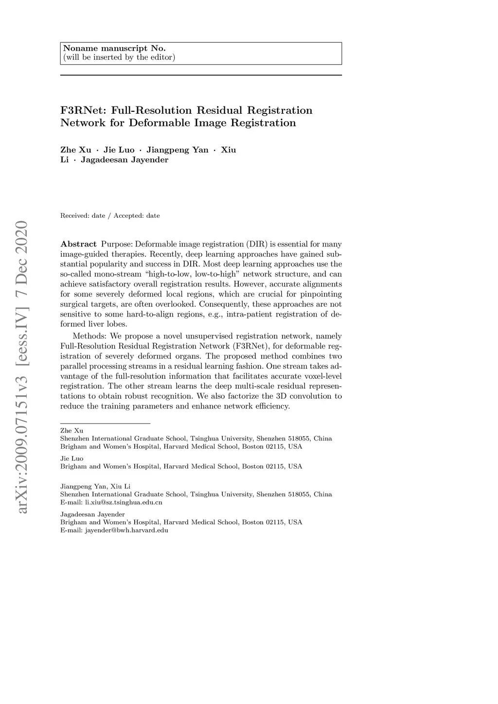 F3RNet: Full-Resolution Residual Registration Network for Deformable