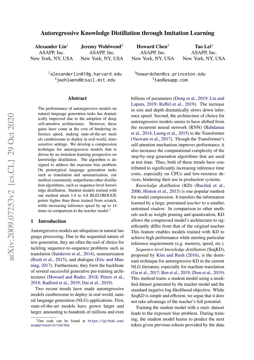 The performance of autoregressive models on natural language generation tasks has dramatically improved due to the adoption of deep, self-attentive architectures. However, these gains have come at the cost of hindering inference speed, making state-of-the-art models cumbersome to deploy in real-world, time-sensitive settings. We develop a compression technique for autoregressive models that is driven by an imitation learning perspective on knowledge distillation. The algorithm is designed to address the exposure bias problem. On prototypical language generation tasks such as translation and summarization, our method consistently outperforms other distillation algorithms, such as sequence-level knowledge distillation. Student models trained with our method attain 1.4 to 4.8 BLEU/ROUGE points higher than those trained from scratch, while increasing inference speed by up to 14 times in comparison to the teacher model.