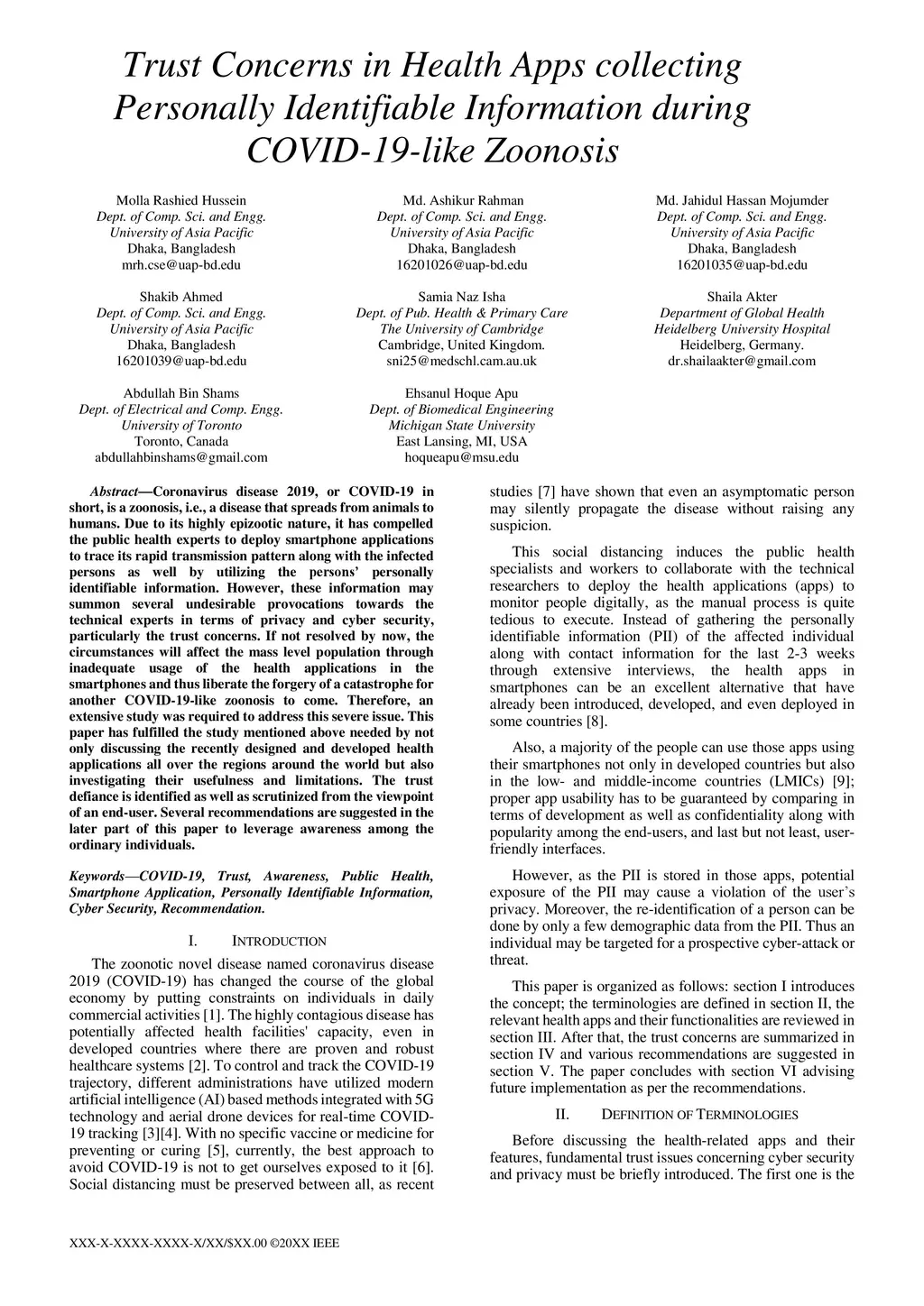 Coronavirus disease 2019, or COVID-19 in short, is a zoonosis, i.e., a disease that spreads from animals to humans. Due to its highly epizootic nature, it has compelled the public health experts to deploy smartphone applications to trace its rapid transmission pattern along with the infected persons as well by utilizing the persons' personally identifiable information. However, these information may summon several undesirable provocations towards the technical experts in terms of privacy and cyber security, particularly the trust concerns. If not resolved by now, the circumstances will affect the mass level population through inadequate usage of the health applications in the smartphones and thus liberate the forgery of a catastrophe for another COVID-19-like zoonosis to come. Therefore, an extensive study was required to address this severe issue. This paper has fulfilled the study mentioned above needed by not only discussing the recently designed and developed health applications all over the regions around the world but also investigating their usefulness and limitations. The trust defiance is identified as well as scrutinized from the viewpoint of an end-user. Several recommendations are suggested in the later part of this paper to leverage awareness among the ordinary individuals.