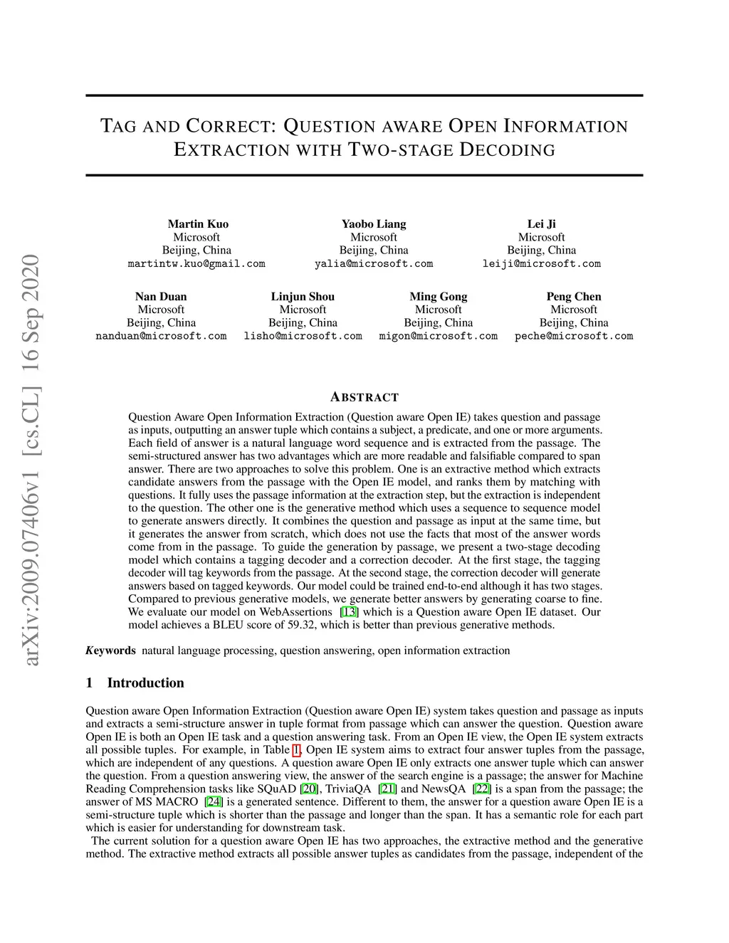 Question Aware Open Information Extraction (Question aware Open IE) takes question and passage as inputs, outputting an answer tuple which contains a subject, a predicate, and one or more arguments. Each field of answer is a natural language word sequence and is extracted from the passage. The semi-structured answer has two advantages which are more readable and falsifiable compared to span answer. There are two approaches to solve this problem. One is an extractive method which extracts candidate answers from the passage with the Open IE model, and ranks them by matching with questions. It fully uses the passage information at the extraction step, but the extraction is independent to the question. The other one is the generative method which uses a sequence to sequence model to generate answers directly. It combines the question and passage as input at the same time, but it generates the answer from scratch, which does not use the facts that most of the answer words come from in the passage. To guide the generation by passage, we present a two-stage decoding model which contains a tagging decoder and a correction decoder. At the first stage, the tagging decoder will tag keywords from the passage. At the second stage, the correction decoder will generate answers based on tagged keywords. Our model could be trained end-to-end although it has two stages. Compared to previous generative models, we generate better answers by generating coarse to fine. We evaluate our model on WebAssertions (Yan et al., 2018) which is a Question aware Open IE dataset. Our model achieves a BLEU score of 59.32, which is better than previous generative methods.