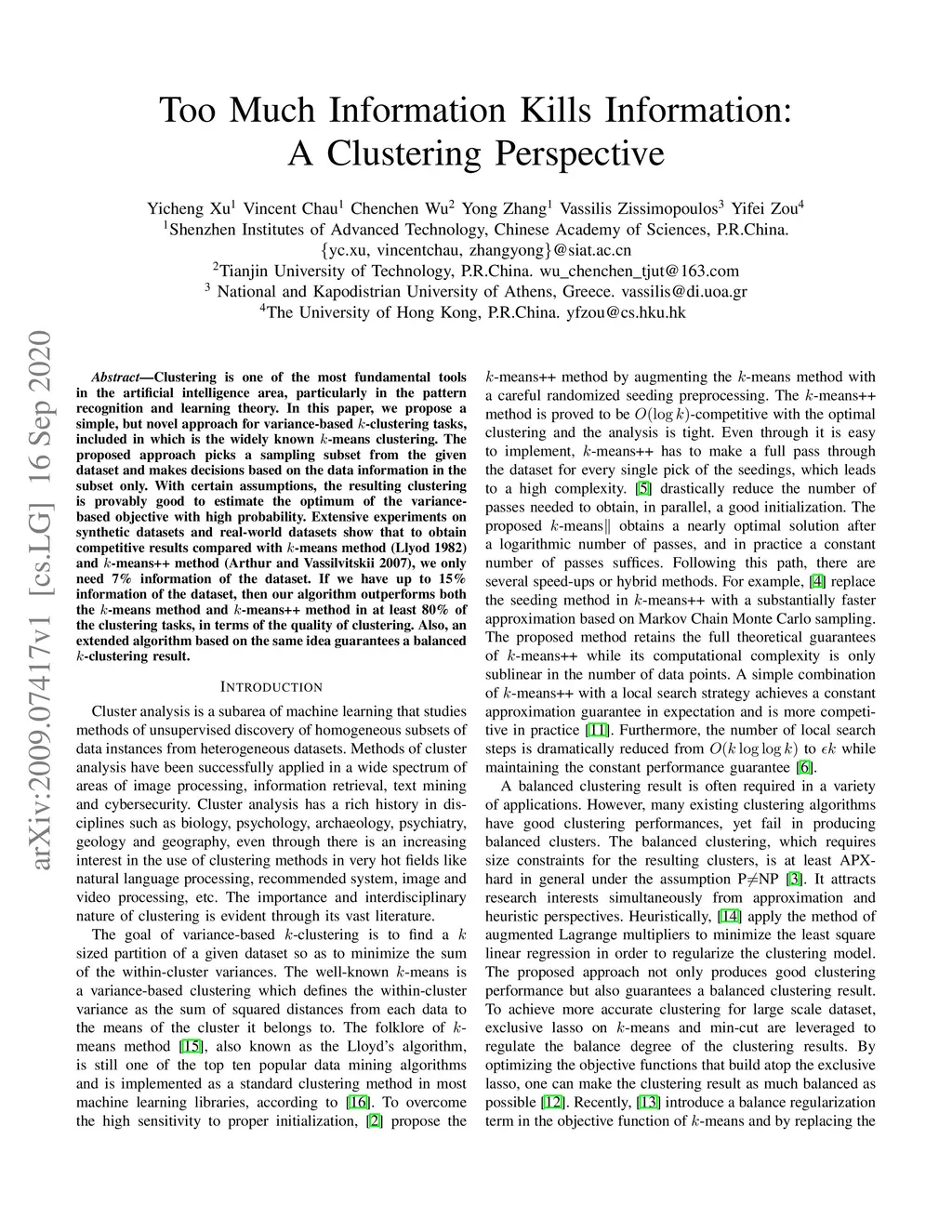 Clustering is one of the most fundamental tools in the artificial intelligence area, particularly in the pattern recognition and learning theory. In this paper, we propose a simple, but novel approach for variance-based k-clustering tasks, included in which is the widely known k-means clustering. The proposed approach picks a sampling subset from the given dataset and makes decisions based on the data information in the subset only. With certain assumptions, the resulting clustering is provably good to estimate the optimum of the variance-based objective with high probability. Extensive experiments on synthetic datasets and real-world datasets show that to obtain competitive results compared with k-means method (Llyod 1982) and k-means++ method (Arthur and Vassilvitskii 2007), we only need 7% information of the dataset. If we have up to 15% information of the dataset, then our algorithm outperforms both the k-means method and k-means++ method in at least 80% of the clustering tasks, in terms of the quality of clustering. Also, an extended algorithm based on the same idea guarantees a balanced k-clustering result.