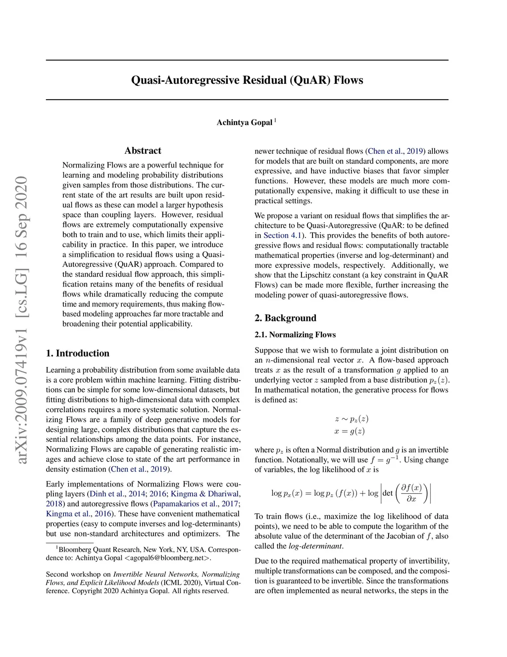 Normalizing Flows are a powerful technique for learning and modeling probability distributions given samples from those distributions. The current state of the art results are built upon residual flows as these can model a larger hypothesis space than coupling layers. However, residual flows are extremely computationally expensive both to train and to use, which limits their applicability in practice. In this paper, we introduce a simplification to residual flows using a Quasi-Autoregressive (QuAR) approach. Compared to the standard residual flow approach, this simplification retains many of the benefits of residual flows while dramatically reducing the compute time and memory requirements, thus making flow-based modeling approaches far more tractable and broadening their potential applicability.