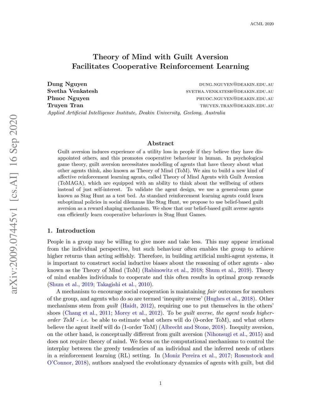 Guilt aversion induces experience of a utility loss in people if they believe they have disappointed others, and this promotes cooperative behaviour in human. In psychological game theory, guilt aversion necessitates modelling of agents that have theory about what other agents think, also known as Theory of Mind (ToM). We aim to build a new kind of affective reinforcement learning agents, called Theory of Mind Agents with Guilt Aversion (ToMAGA), which are equipped with an ability to think about the wellbeing of others instead of just self-interest. To validate the agent design, we use a general-sum game known as Stag Hunt as a test bed. As standard reinforcement learning agents could learn suboptimal policies in social dilemmas like Stag Hunt, we propose to use belief-based guilt aversion as a reward shaping mechanism. We show that our belief-based guilt averse agents can efficiently learn cooperative behaviours in Stag Hunt Games.