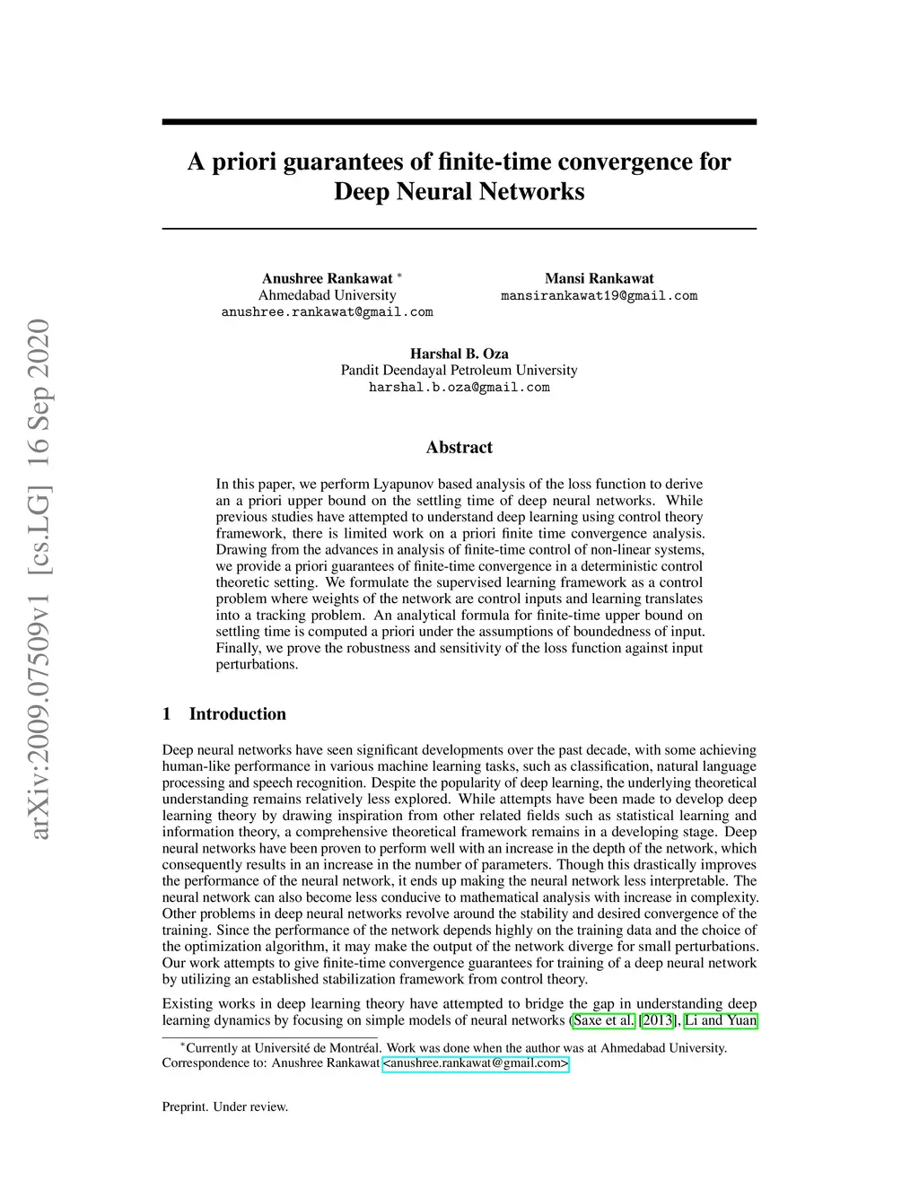 A priori guarantees of finite-time convergence for Deep Neural Networks