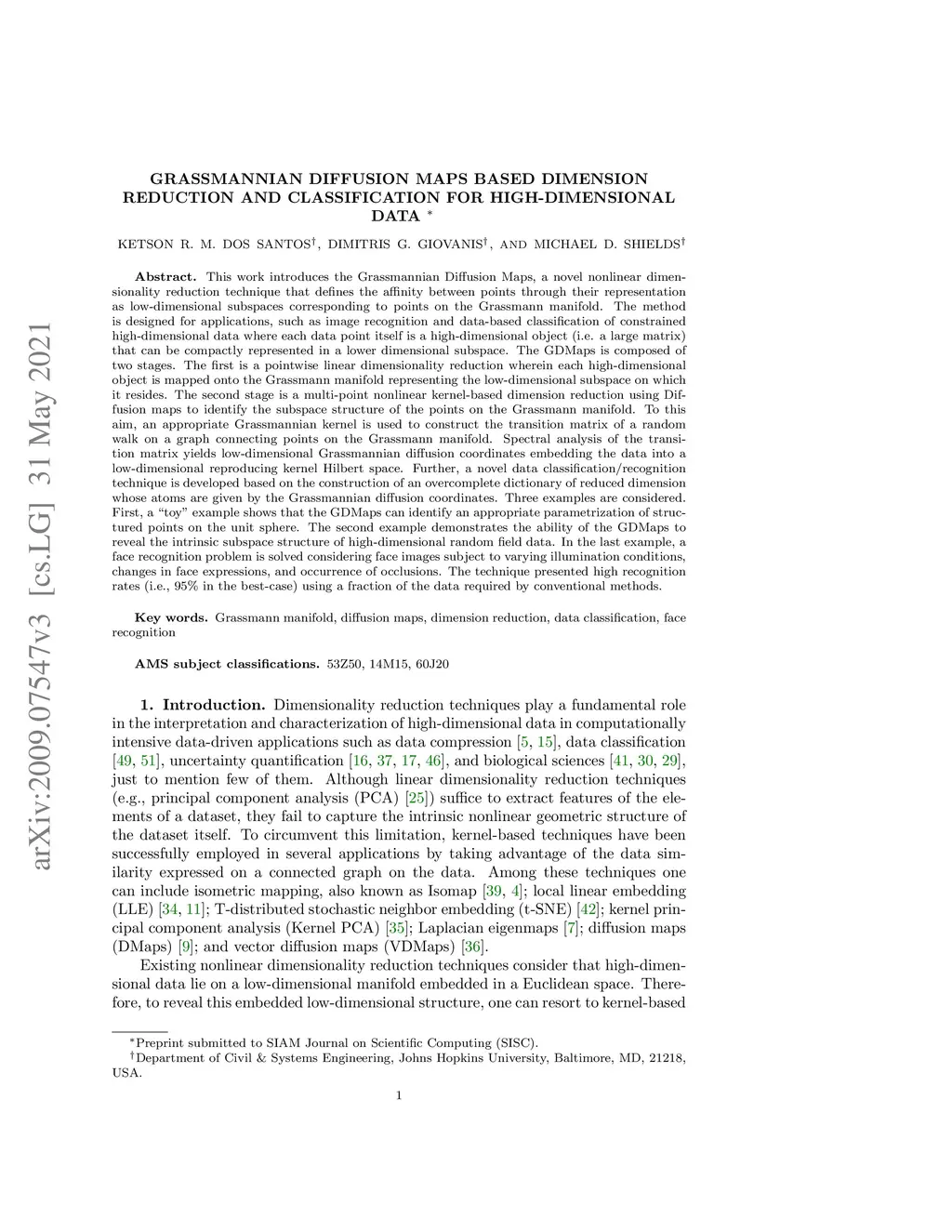 Grassmannian diffusion maps based dimension reduction and classification