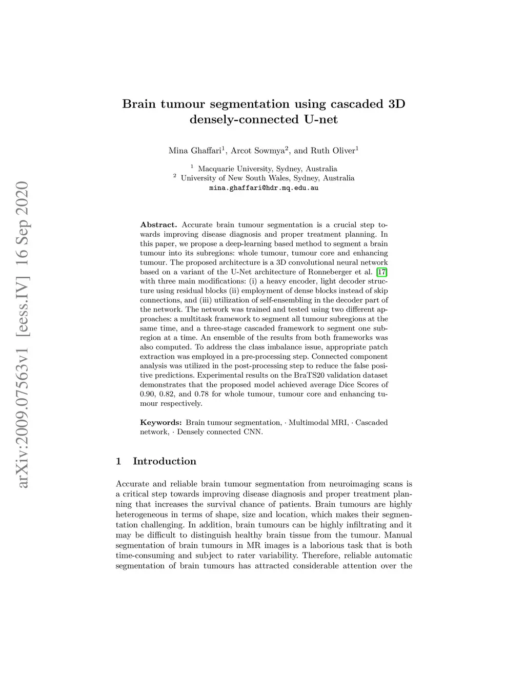 Brain tumour segmentation using cascaded 3D densely-connected U-net