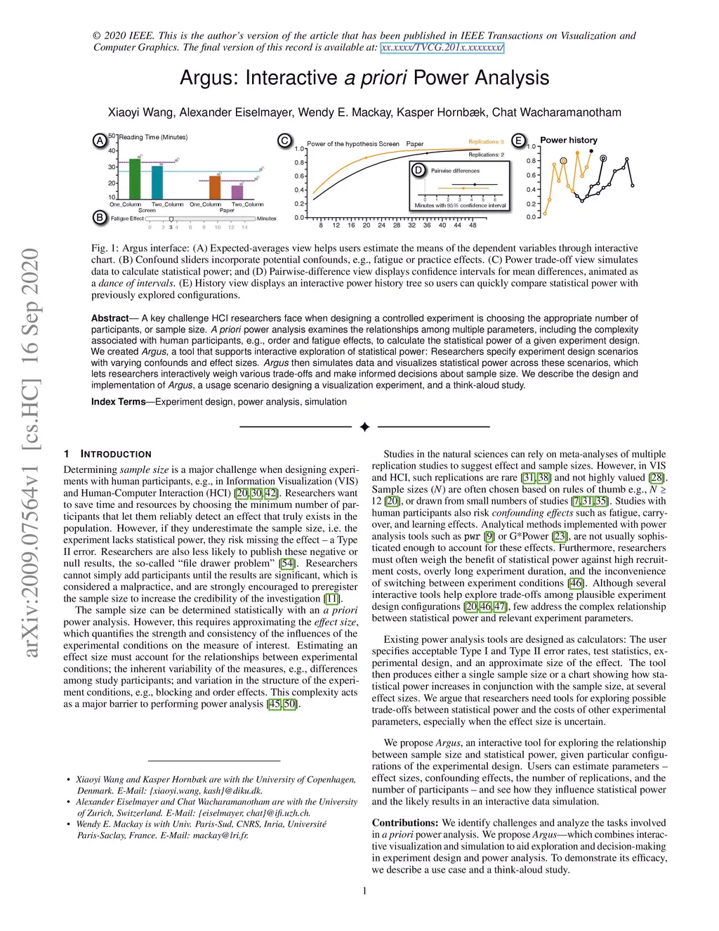 A key challenge HCI researchers face when designing a controlled experiment is choosing the appropriate number of participants, or sample size. A prior power analysis examines the relationships among multiple parameters, including the complexity associated with human participants, e.g., order and fatigue effects, to calculate the statistical power of a given experiment design. We created Argus, a tool that supports interactive exploration of statistical power: Researchers specify experiment design scenarios with varying confounds and effect sizes. Argus then simulates data and visualizes statistical power across these scenarios, which lets researchers interactively weigh various trade-offs and make informed decisions about sample size. We describe the design and implementation of Argus, a usage scenario designing a visualization experiment, and a think-aloud study.
