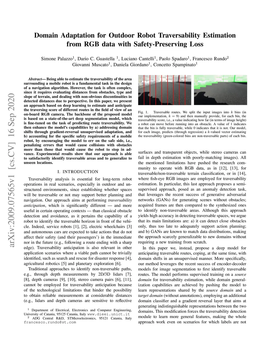Being able to estimate the traversability of the area surrounding a mobile robot is a fundamental task in the design of a navigation algorithm. However, the task is often complex, since it requires evaluating distances from obstacles, type and slope of terrain, and dealing with non-obvious discontinuities in detected distances due to perspective. In this paper, we present an approach based on deep learning to estimate and anticipate the traversing score of different routes in the field of view of an on-board RGB camera. The backbone of the proposed model is based on a state-of-the-art deep segmentation model, which is fine-tuned on the task of predicting route traversability. We then enhance the model's capabilities by a) addressing domain shifts through gradient-reversal unsupervised adaptation, and b) accounting for the specific safety requirements of a mobile robot, by encouraging the model to err on the safe side, i.e., penalizing errors that would cause collisions with obstacles more than those that would cause the robot to stop in advance. Experimental results show that our approach is able to satisfactorily identify traversable areas and to generalize to unseen locations.