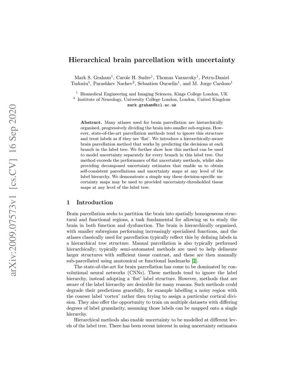 Many atlases used for brain parcellation are hierarchically organised, progressively dividing the brain into smaller sub-regions. However, state-of-the-art parcellation methods tend to ignore this structure and treat labels as if they are `flat'. We introduce a hierarchically-aware brain parcellation method that works by predicting the decisions at each branch in the label tree. We further show how this method can be used to model uncertainty separately for every branch in this label tree. Our method exceeds the performance of flat uncertainty methods, whilst also providing decomposed uncertainty estimates that enable us to obtain self-consistent parcellations and uncertainty maps at any level of the label hierarchy. We demonstrate a simple way these decision-specific uncertainty maps may be used to provided uncertainty-thresholded tissue maps at any level of the label tree.