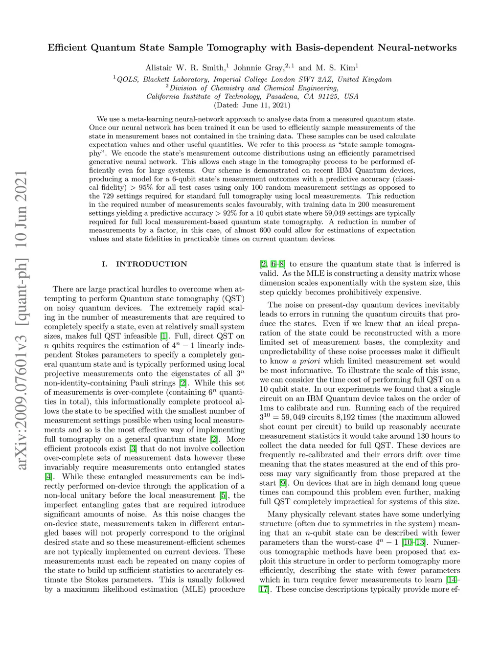 We use a meta-learning neural-network approach to predict measurement outcomes of a quantum state in arbitrary local bases and thus carry out an approximate quantum state tomography. Each stage of this procedure can be performed efficiently, allowing it to be used effectively on large systems. We demonstrate this approach on the most recent noisy intermediate-scale IBM Quantum devices, achieving an accurate generative model for a 6-qubit state's measurement outcomes with only 100 random measurement settings as opposed to the 729 settings required for full tomography. This reduction in the required number of measurements scales favourably, with around 200 measurement settings yielding good results for a 10 qubit state that would require 59,049 settings for full quantum state tomography. This reduction in the number of measurement settings coupled with the efficiency of the procedure could allow for estimations of expectation values and state fidelities in practicable times on current quantum devices. For suitable states, this could then help in increasing the speed of other optimization schemes when attempting to produce states on noisy quantum devices at a scale where traditional maximum likelihood based approaches are impractical.