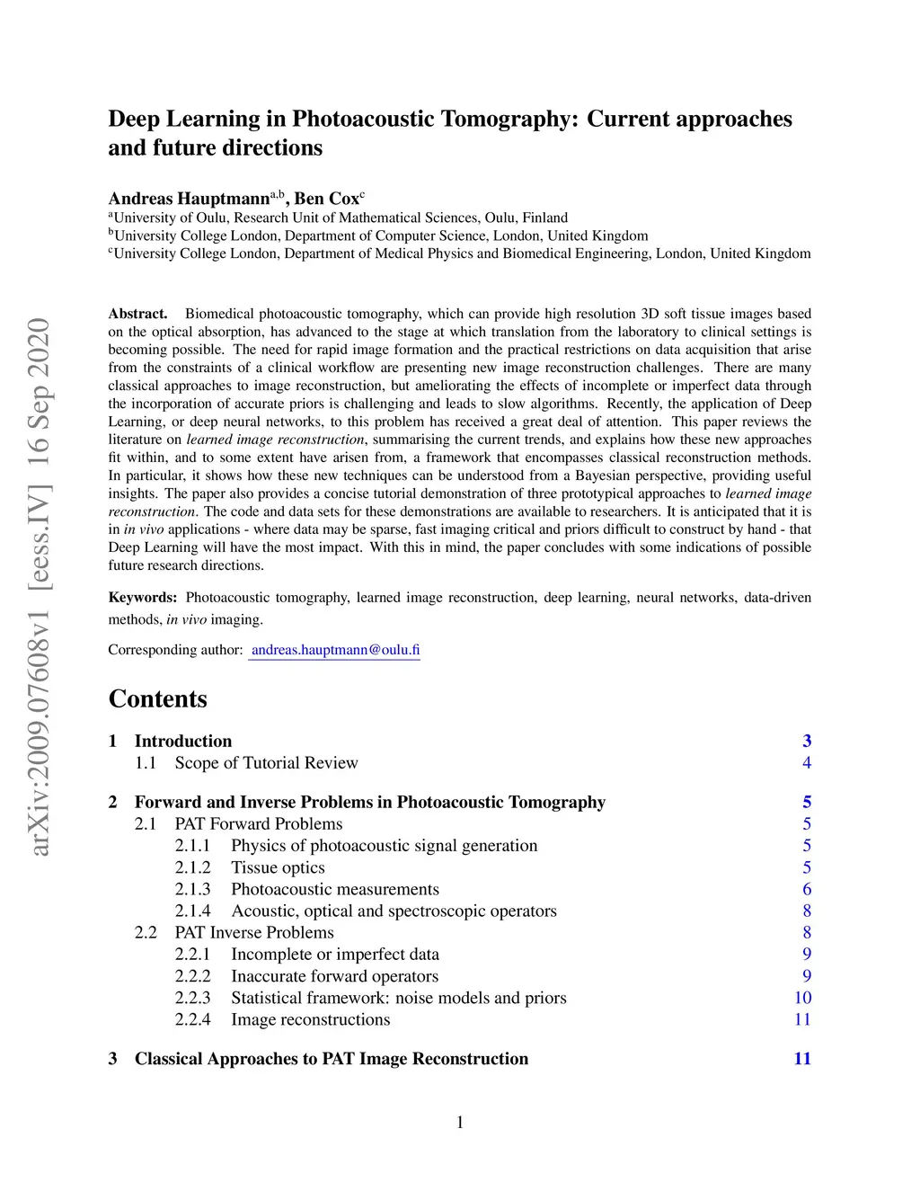 Biomedical photoacoustic tomography, which can provide high resolution 3D soft tissue images based on the optical absorption, has advanced to the stage at which translation from the laboratory to clinical settings is becoming possible. The need for rapid image formation and the practical restrictions on data acquisition that arise from the constraints of a clinical workflow are presenting new image reconstruction challenges. There are many classical approaches to image reconstruction, but ameliorating the effects of incomplete or imperfect data through the incorporation of accurate priors is challenging and leads to slow algorithms. Recently, the application of Deep Learning, or deep neural networks, to this problem has received a great deal of attention. This paper reviews the literature on learned image reconstruction, summarising the current trends, and explains how these new approaches fit within, and to some extent have arisen from, a framework that encompasses classical reconstruction methods. In particular, it shows how these new techniques can be understood from a Bayesian perspective, providing useful insights. The paper also provides a concise tutorial demonstration of three prototypical approaches to learned image reconstruction. The code and data sets for these demonstrations are available to researchers. It is anticipated that it is in in vivo applications - where data may be sparse, fast imaging critical and priors difficult to construct by hand - that Deep Learning will have the most impact. With this in mind, the paper concludes with some indications of possible future research directions.