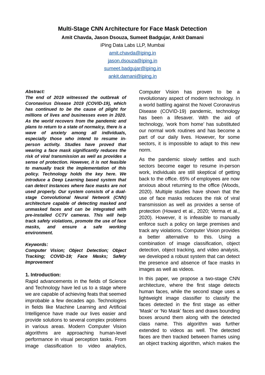 The end of 2019 witnessed the outbreak of Coronavirus Disease 2019 (COVID-19), which has continued to be the cause of plight for millions of lives and businesses even in 2020. As the world recovers from the pandemic and plans to return to a state of normalcy, there is a wave of anxiety among all individuals, especially those who intend to resume in-person activity. Studies have proved that wearing a face mask significantly reduces the risk of viral transmission as well as provides a sense of protection. However, it is not feasible to manually track the implementation of this policy. Technology holds the key here. We introduce a Deep Learning based system that can detect instances where face masks are not used properly. Our system consists of a dual-stage Convolutional Neural Network (CNN) architecture capable of detecting masked and unmasked faces and can be integrated with pre-installed CCTV cameras. This will help track safety violations, promote the use of face masks, and ensure a safe working environment.