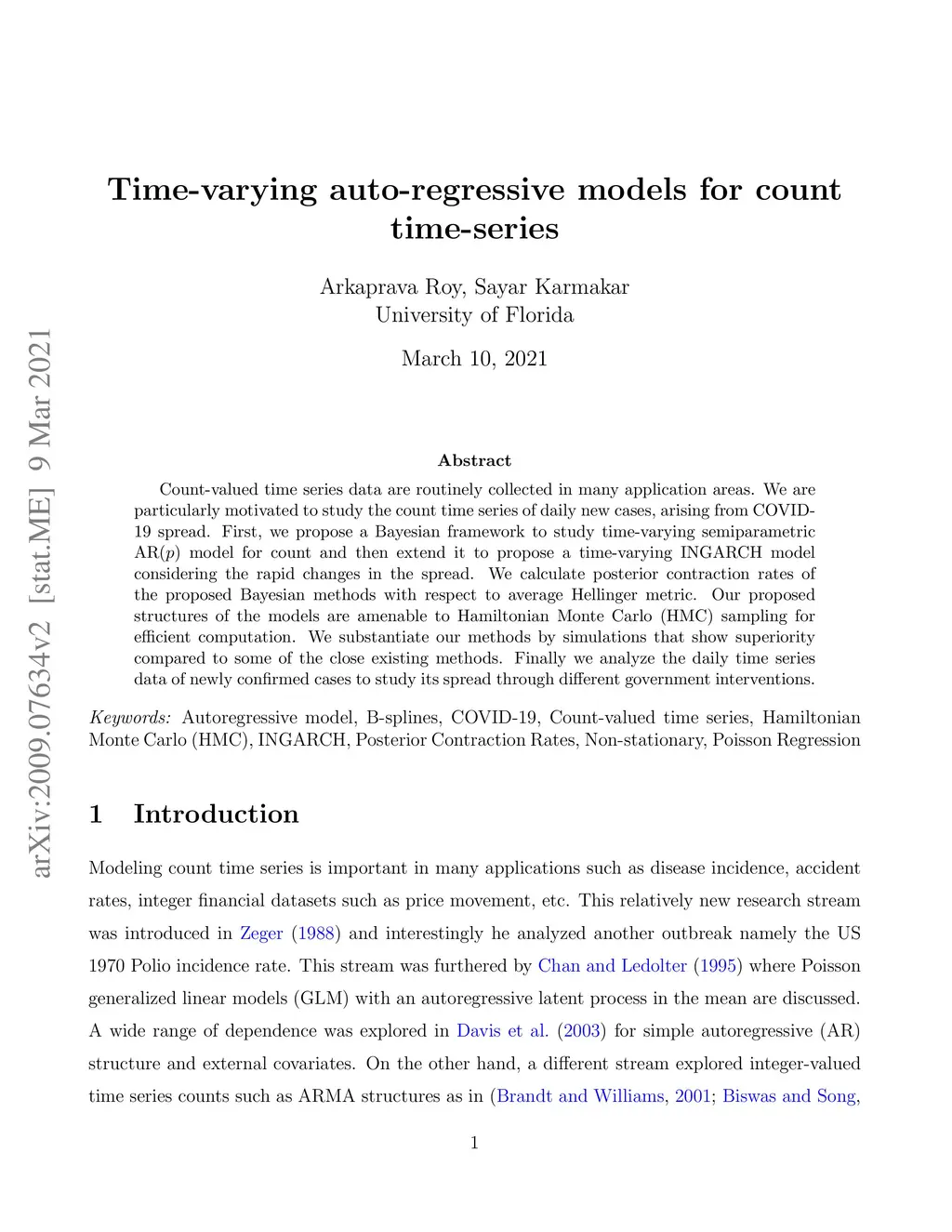 Count-valued time series data are routinely collected in many application areas. We are particularly motivated to study the count time series of daily new cases, arising from COVID-19 spread. We propose two Bayesian models, a time-varying semiparametric AR(p) model for count and then a time-varying INGARCH model considering the rapid changes in the spread. We calculate posterior contraction rates of the proposed Bayesian methods with respect to average Hellinger metric. Our proposed structures of the models are amenable to Hamiltonian Monte Carlo (HMC) sampling for efficient computation. We substantiate our methods by simulations that show superiority compared to some of the close existing methods. Finally we analyze the daily time series data of newly confirmed cases to study its spread through different government interventions.