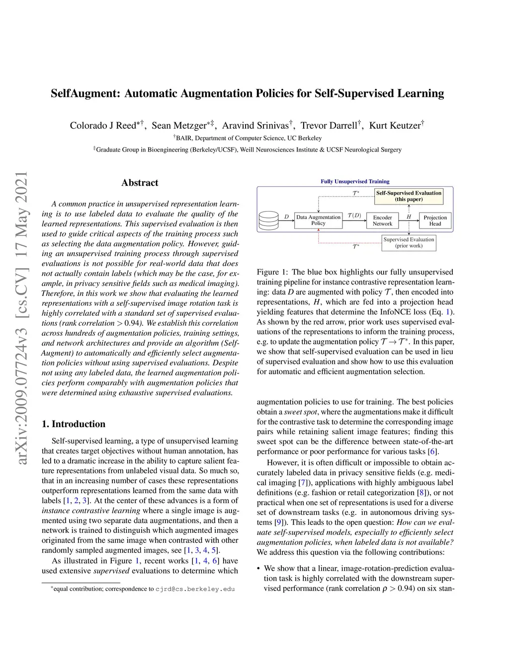 A common practice in unsupervised representation learning is to use labeled data to evaluate the quality of the learned representations. This supervised evaluation is then used to guide critical aspects of the training process such as selecting the data augmentation policy. However, guiding an unsupervised training process through supervised evaluations is not possible for real-world data that does not actually contain labels (which may be the case, for example, in privacy sensitive fields such as medical imaging). Therefore, in this work we show that evaluating the learned representations with a self-supervised image rotation task is highly correlated with a standard set of supervised evaluations (rank correlation ). We establish this correlation across hundreds of augmentation policies, training settings, and network architectures and provide an algorithm (SelfAugment) to automatically and efficiently select augmentation policies without using supervised evaluations. Despite not using any labeled data, the learned augmentation policies perform comparably with augmentation policies that were determined using exhaustive supervised evaluations.