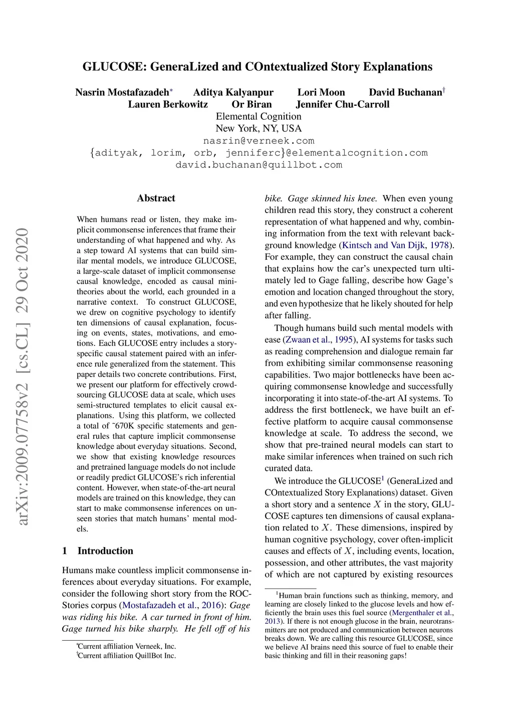 GLUCOSE: GeneraLized and COntextualized Story Explanations