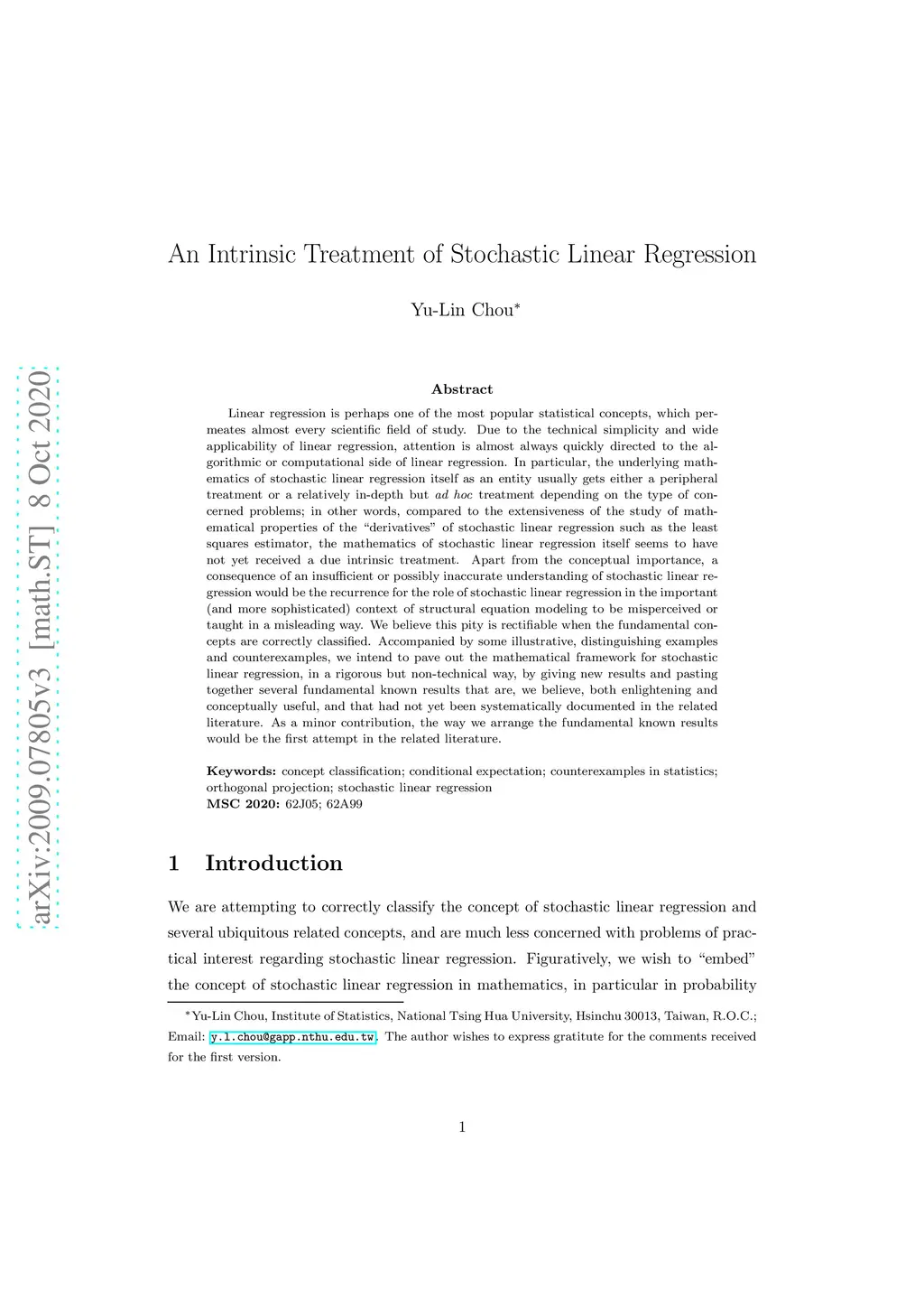 Linear regression is perhaps one of the most popular statistical concepts, which permeates almost every scientific field of study. Due to the technical simplicity and wide applicability of linear regression, attention is almost always quickly directed to the algorithmic or computational side of linear regression. In particular, the underlying mathematics of stochastic linear regression itself as an entity usually gets either a peripheral treatment or a relatively in-depth but ad hoc treatment depending on the type of concerned problems; in other words, compared to the extensiveness of the study of mathematical properties of the "derivatives" of stochastic linear regression such as the least squares estimator, the mathematics of stochastic linear regression itself seems to have not yet received a due intrinsic treatment. Apart from the conceptual importance, a consequence of an insufficient or possibly inaccurate understanding of stochastic linear regression would be the recurrence for the role of stochastic linear regression in the important (and more sophisticated) context of structural equation modeling to be misperceived or taught in a misleading way. We believe this pity is rectifiable when the fundamental concepts are correctly classified. Accompanied by some illustrative, distinguishing examples and counterexamples, we intend to pave out the mathematical framework for stochastic linear regression, in a rigorous but non-technical way, by giving new results and pasting together several fundamental known results that are, we believe, both enlightening and conceptually useful, and that had not yet been systematically documented in the related literature. As a minor contribution, the way we arrange the fundamental known results would be the first attempt in the related literature.