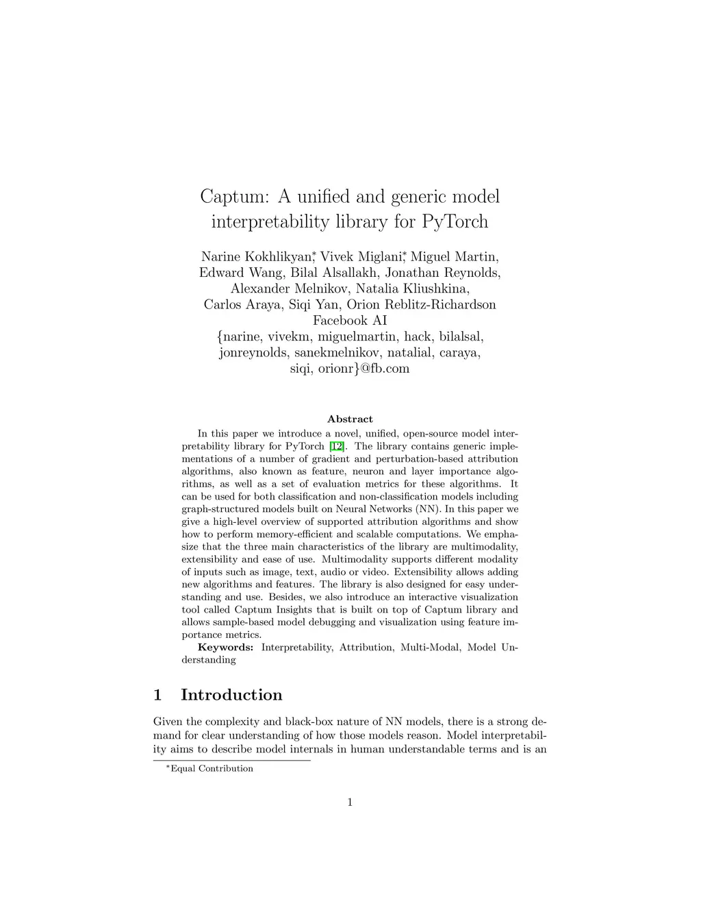 In this paper we introduce a novel, unified, open-source model interpretability library for PyTorch [12]. The library contains generic implementations of a number of gradient and perturbation-based attribution algorithms, also known as feature, neuron and layer importance algorithms, as well as a set of evaluation metrics for these algorithms. It can be used for both classification and non-classification models including graph-structured models built on Neural Networks (NN). In this paper we give a high-level overview of supported attribution algorithms and show how to perform memory-efficient and scalable computations. We emphasize that the three main characteristics of the library are multimodality, extensibility and ease of use. Multimodality supports different modality of inputs such as image, text, audio or video. Extensibility allows adding new algorithms and features. The library is also designed for easy understanding and use. Besides, we also introduce an interactive visualization tool called Captum Insights that is built on top of Captum library and allows sample-based model debugging and visualization using feature importance metrics.