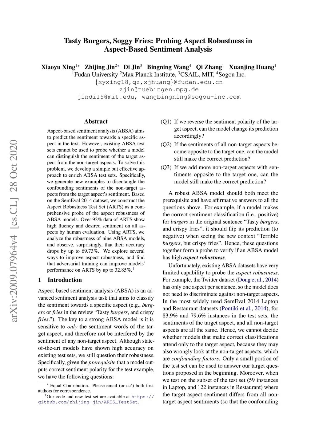 Aspect-based sentiment analysis (ABSA) aims to predict the sentiment towards a specific aspect in the text. However, existing ABSA test sets cannot be used to probe whether a model can distinguish the sentiment of the target aspect from the non-target aspects. To solve this problem, we develop a simple but effective approach to enrich ABSA test sets. Specifically, we generate new examples to disentangle the confounding sentiments of the non-target aspects from the target aspect's sentiment. Based on the SemEval 2014 dataset, we construct the Aspect Robustness Test Set (ARTS) as a comprehensive probe of the aspect robustness of ABSA models. Over 92% data of ARTS show high fluency and desired sentiment on all aspects by human evaluation. Using ARTS, we analyze the robustness of nine ABSA models, and observe, surprisingly, that their accuracy drops by up to 69.73%. We explore several ways to improve aspect robustness, and find that adversarial training can improve models' performance on ARTS by up to 32.85%. Our code and new test set are available at https://github.com/zhijing-jin/ARTS_TestSet