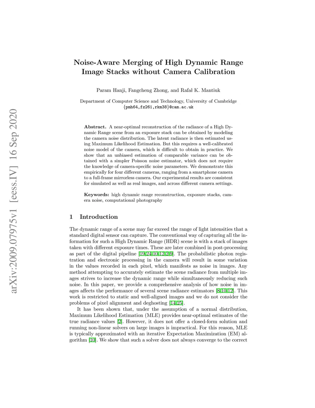 Noise-Aware Merging of High Dynamic Range Image Stacks without Camera