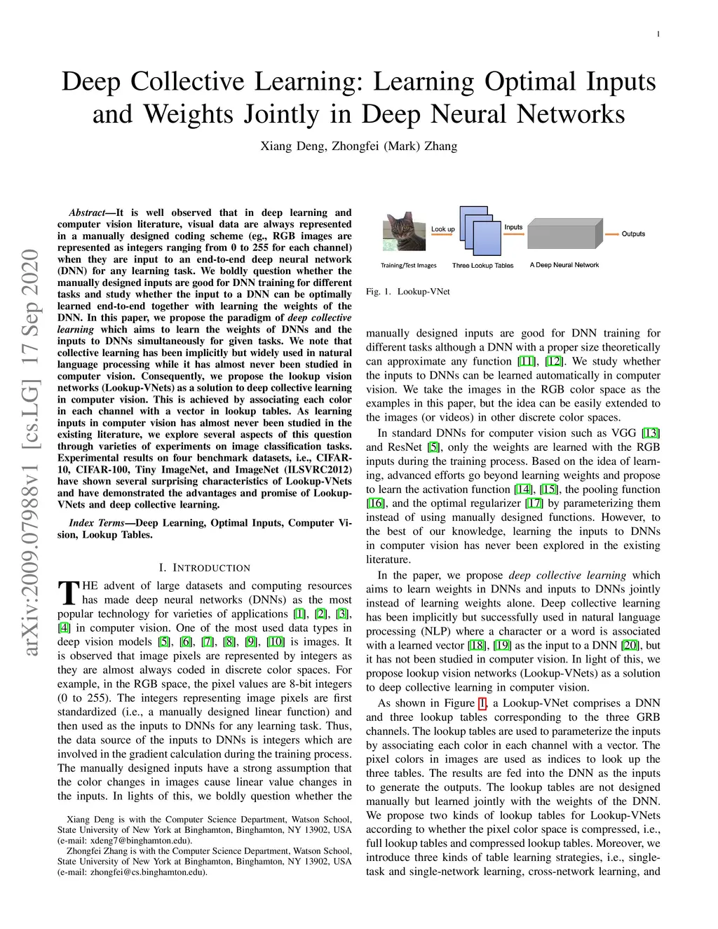 It is well observed that in deep learning and computer vision literature, visual data are always represented in a manually designed coding scheme (eg., RGB images are represented as integers ranging from 0 to 255 for each channel) when they are input to an end-to-end deep neural network (DNN) for any learning task. We boldly question whether the manually designed inputs are good for DNN training for different tasks and study whether the input to a DNN can be optimally learned end-to-end together with learning the weights of the DNN. In this paper, we propose the paradigm of {\em deep collective learning} which aims to learn the weights of DNNs and the inputs to DNNs simultaneously for given tasks. We note that collective learning has been implicitly but widely used in natural language processing while it has almost never been studied in computer vision. Consequently, we propose the lookup vision networks (Lookup-VNets) as a solution to deep collective learning in computer vision. This is achieved by associating each color in each channel with a vector in lookup tables. As learning inputs in computer vision has almost never been studied in the existing literature, we explore several aspects of this question through varieties of experiments on image classification tasks. Experimental results on four benchmark datasets, i.e., CIFAR-10, CIFAR-100, Tiny ImageNet, and ImageNet (ILSVRC2012) have shown several surprising characteristics of Lookup-VNets and have demonstrated the advantages and promise of Lookup-VNets and deep collective learning.