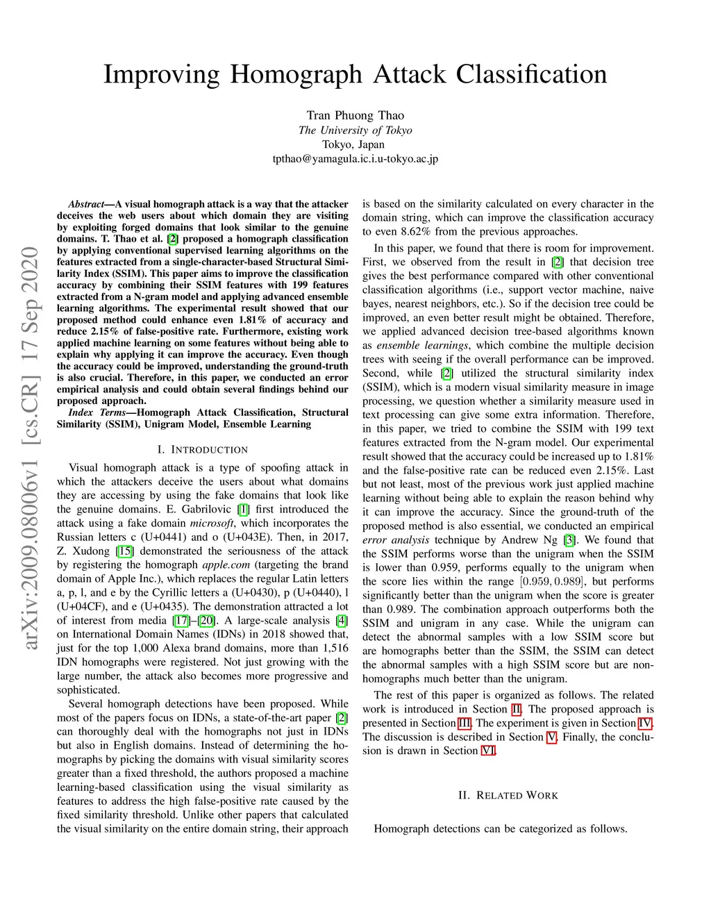 A visual homograph attack is a way that the attacker deceives the web users about which domain they are visiting by exploiting forged domains that look similar to the genuine domains. T. Thao et al. (IFIP SEC'19) proposed a homograph classification by applying conventional supervised learning algorithms on the features extracted from a single-character-based Structural Similarity Index (SSIM). This paper aims to improve the classification accuracy by combining their SSIM features with 199 features extracted from a N-gram model and applying advanced ensemble learning algorithms. The experimental result showed that our proposed method could enhance even 1.81% of accuracy and reduce 2.15% of false-positive rate. Furthermore, existing work applied machine learning on some features without being able to explain why applying it can improve the accuracy. Even though the accuracy could be improved, understanding the ground-truth is also crucial. Therefore, in this paper, we conducted an error empirical analysis and could obtain several findings behind our proposed approach.