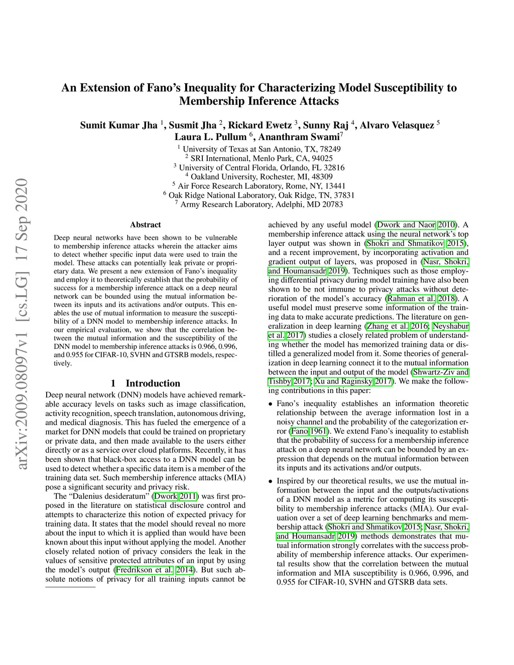 Deep neural networks have been shown to be vulnerable to membership inference attacks wherein the attacker aims to detect whether specific input data were used to train the model. These attacks can potentially leak private or proprietary data. We present a new extension of Fano's inequality and employ it to theoretically establish that the probability of success for a membership inference attack on a deep neural network can be bounded using the mutual information between its inputs and its activations. This enables the use of mutual information to measure the susceptibility of a DNN model to membership inference attacks. In our empirical evaluation, we show that the correlation between the mutual information and the susceptibility of the DNN model to membership inference attacks is 0.966, 0.996, and 0.955 for CIFAR-10, SVHN and GTSRB models, respectively.