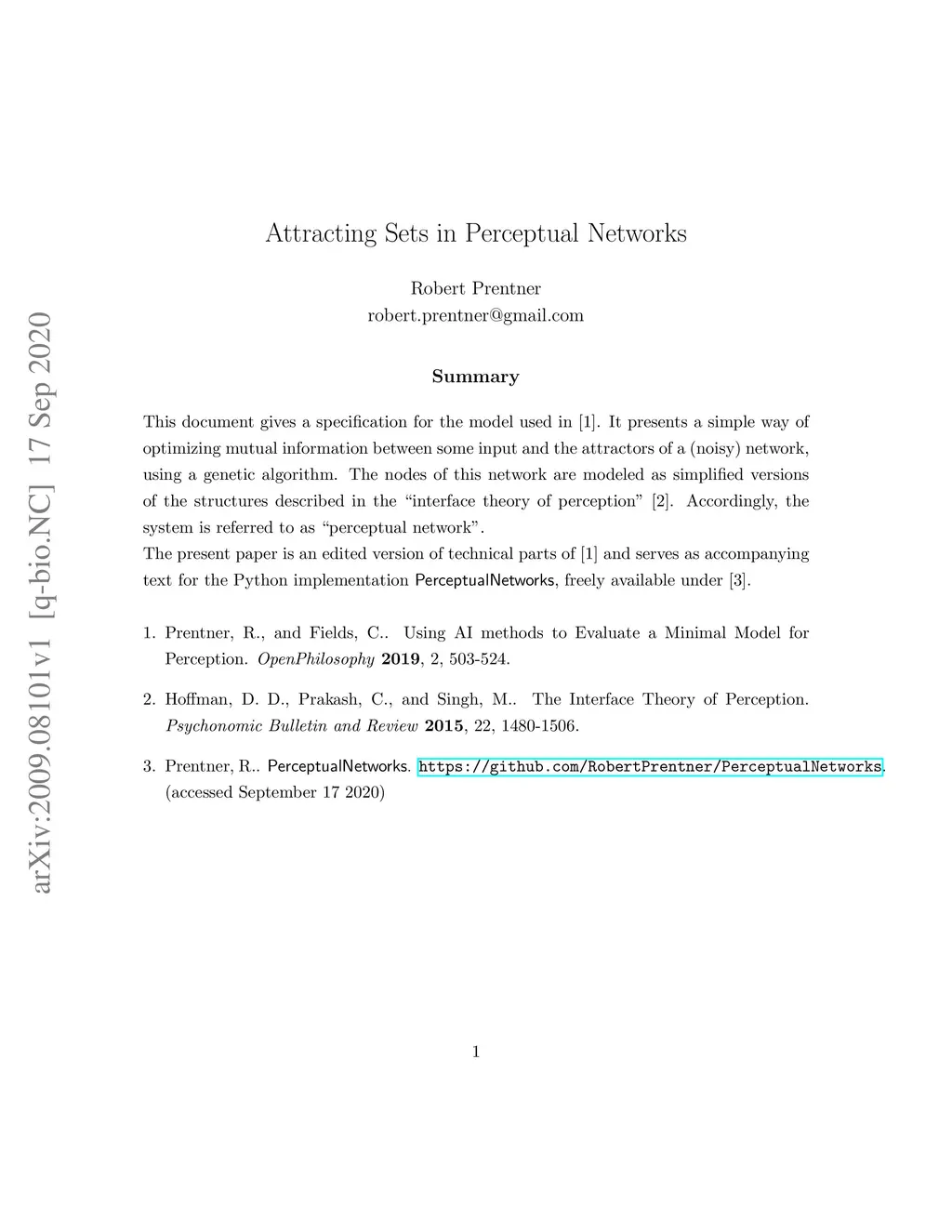 This document gives a specification for the model used in [1]. It presents a simple way of optimizing mutual information between some input and the attractors of a (noisy) network, using a genetic algorithm. The nodes of this network are modeled as simplified versions of the structures described in the "interface theory of perception" [2]. Accordingly, the system is referred to as a "perceptual network". The present paper is an edited version of technical parts of [1] and serves as accompanying text for the Python implementation PerceptualNetworks, freely available under [3]. 1. Prentner, R., and Fields, C.. Using AI methods to Evaluate a Minimal Model for Perception. OpenPhilosophy 2019, 2, 503-524. 2. Hoffman, D. D., Prakash, C., and Singh, M.. The Interface Theory of Perception. Psychonomic Bulletin and Review 2015, 22, 1480-1506. 3. Prentner, R.. PerceptualNetworks. https://github.com/RobertPrentner/PerceptualNetworks. (accessed September 17 2020)