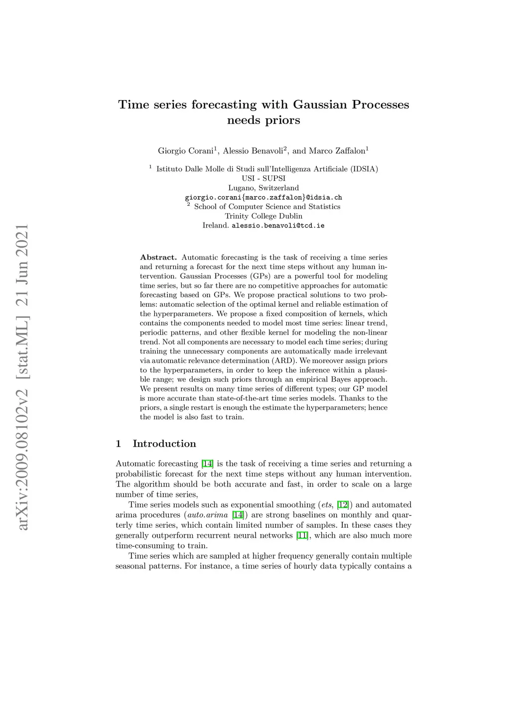 Automatic forecasting is the task of receiving a time series and returning a forecast for the next time steps without any human intervention. Gaussian Processes (GPs) are a powerful tool for modeling time series, but so far there are no competitive approaches for automatic forecasting based on GPs. We propose practical solutions to two problems: automatic selection of the optimal kernel and reliable estimation of the hyperparameters. We propose a fixed composition of kernels, which contains the components needed to model most time series: linear trend, periodic patterns, and other flexible kernel for modeling the non-linear trend. Not all components are necessary to model each time series; during training the unnecessary components are automatically made irrelevant via automatic relevance determination (ARD). We moreover assign priors to the hyperparameters, in order to keep the inference within a plausible range; we design such priors through an empirical Bayes approach. We present results on many time series of different types; our GP model is more accurate than state-of-the-art time series models. Thanks to the priors, a single restart is enough the estimate the hyperparameters; hence the model is also fast to train.