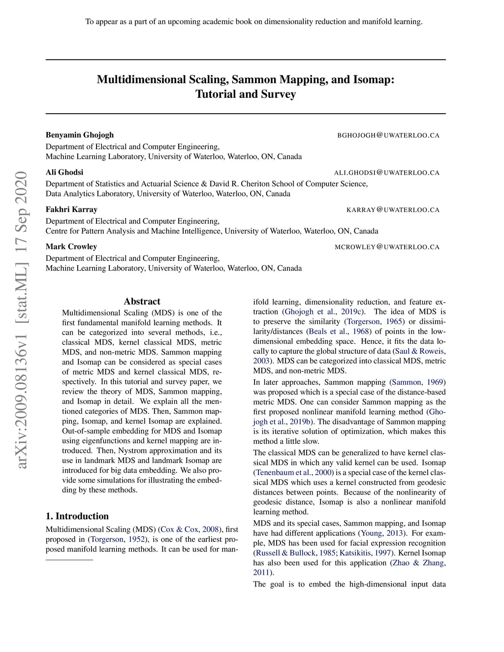 Multidimensional Scaling, Sammon Mapping, and Isomap: Tutorial and