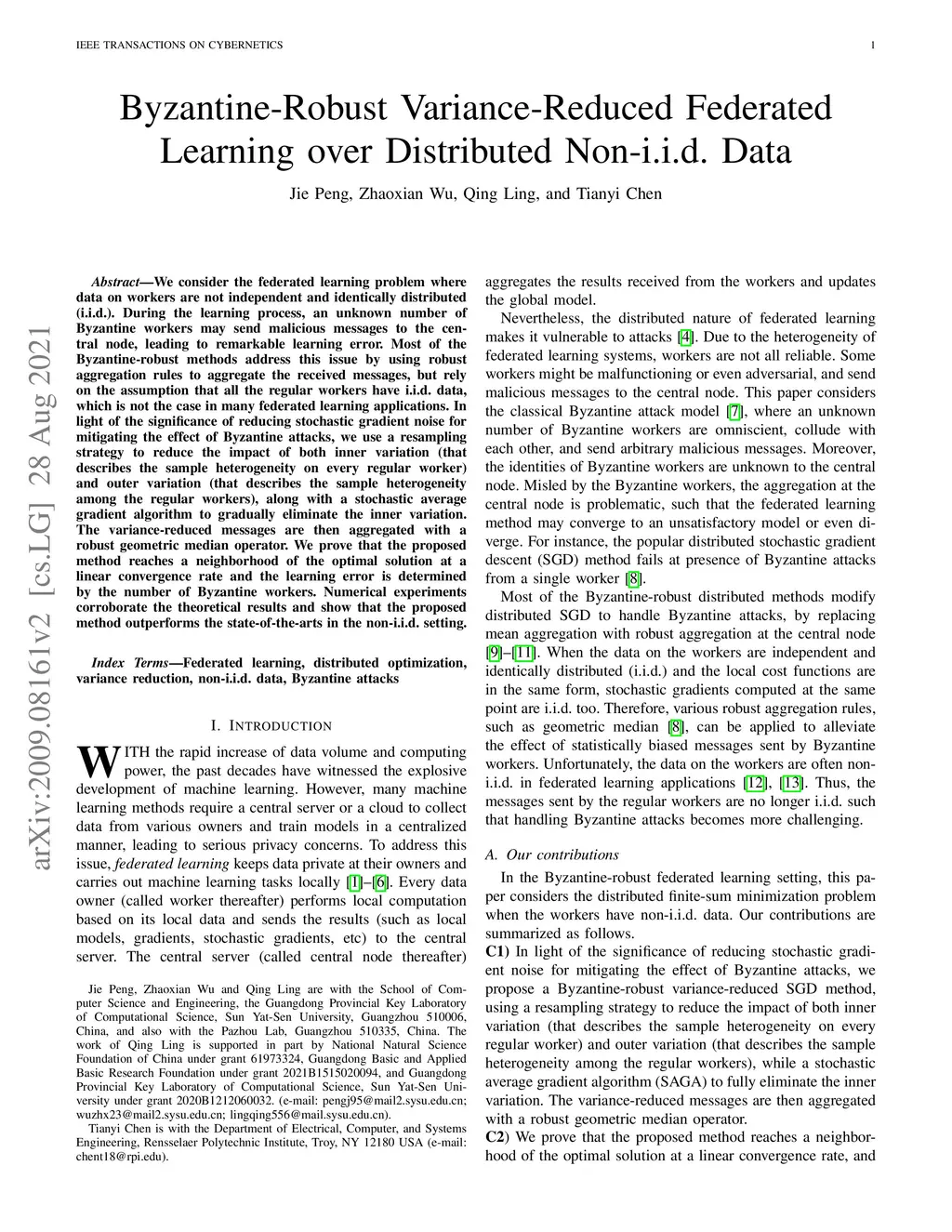 We consider the federated learning problem where data on workers are not independent and identically distributed (i.i.d.). During the learning process, an unknown number of Byzantine workers may send malicious messages to the central node, leading to remarkable learning error. Most of the Byzantine-robust methods address this issue by using robust aggregation rules to aggregate the received messages, but rely on the assumption that all the regular workers have i.i.d. data, which is not the case in many federated learning applications. In light of the significance of reducing stochastic gradient noise for mitigating the effect of Byzantine attacks, we use a resampling strategy to reduce the impact of both inner variation (that describes the sample heterogeneity on every regular worker) and outer variation (that describes the sample heterogeneity among the regular workers), along with a stochastic average gradient algorithm to gradually eliminate the inner variation. The variance-reduced messages are then aggregated with a robust geometric median operator. We prove that the proposed method reaches a neighborhood of the optimal solution at a linear convergence rate and the learning error is determined by the number of Byzantine workers. Numerical experiments corroborate the theoretical results and show that the proposed method outperforms the state-of-the-arts in the non-i.i.d. setting.