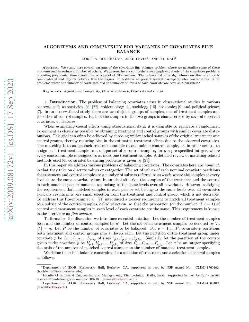 We study here several variants of the covariates fine balance problem where we generalize some of these problems and introduce a number of others. We present here a comprehensive complexity study of the covariates problems providing polynomial time algorithms, or a proof of NP-hardness. The polynomial time algorithms described are mostly combinatorial and rely on network flow techniques. In addition we present several fixed-parameter tractable results for problems where the number of covariates and the number of levels of each covariate are seen as a parameter.