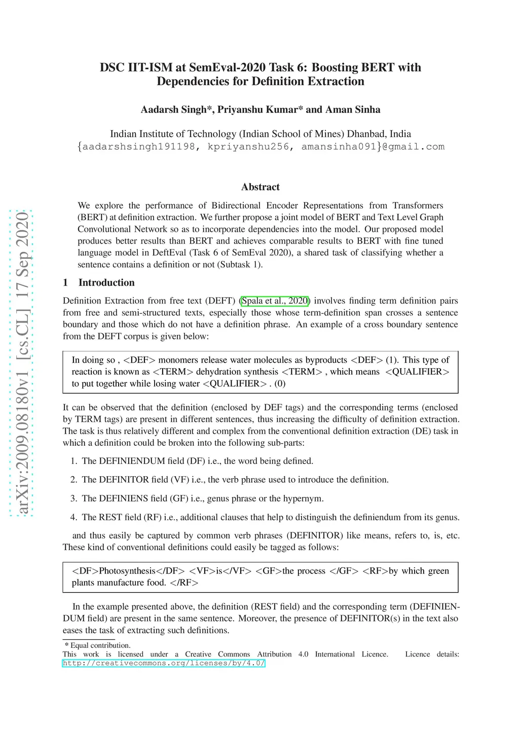 DSC IIT-ISM at SemEval-2020 Task 6: Boosting BERT with Dependencies for