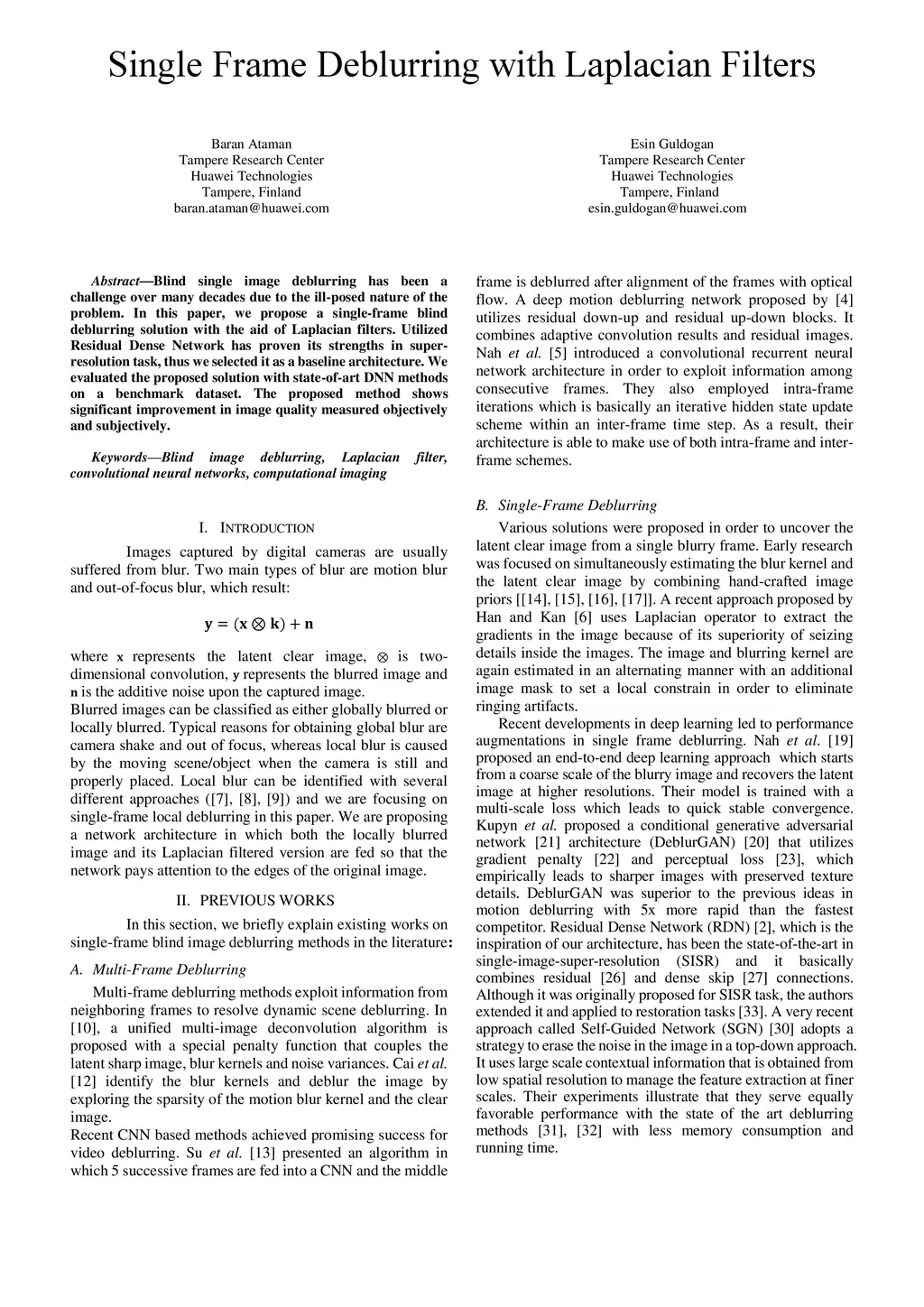 Blind single image deblurring has been a challenge over many decades due to the ill-posed nature of the problem. In this paper, we propose a single-frame blind deblurring solution with the aid of Laplacian filters. Utilized Residual Dense Network has proven its strengths in superresolution task, thus we selected it as a baseline architecture. We evaluated the proposed solution with state-of-art DNN methods on a benchmark dataset. The proposed method shows significant improvement in image quality measured objectively and subjectively.