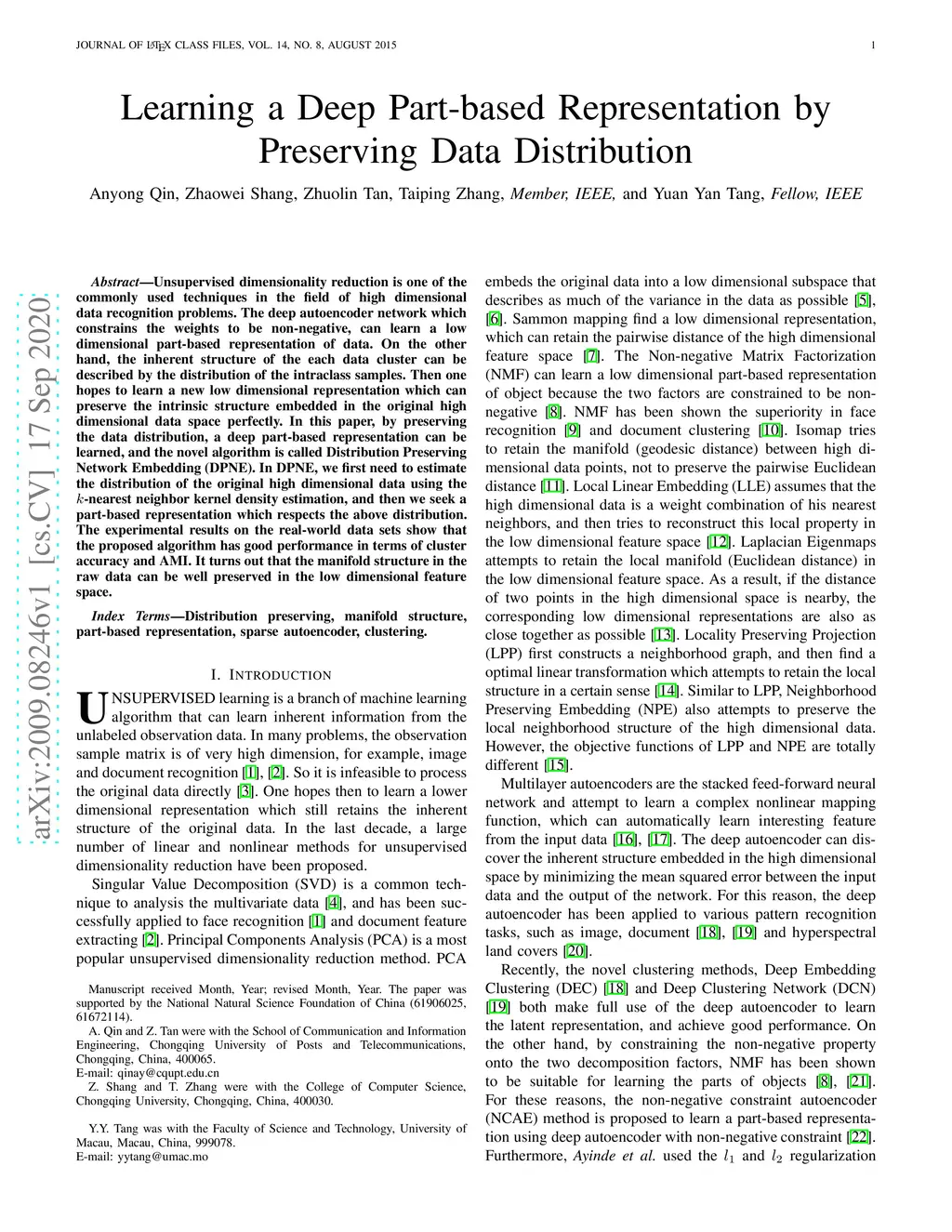 Unsupervised dimensionality reduction is one of the commonly used techniques in the field of high dimensional data recognition problems. The deep autoencoder network which constrains the weights to be non-negative, can learn a low dimensional part-based representation of data. On the other hand, the inherent structure of the each data cluster can be described by the distribution of the intraclass samples. Then one hopes to learn a new low dimensional representation which can preserve the intrinsic structure embedded in the original high dimensional data space perfectly. In this paper, by preserving the data distribution, a deep part-based representation can be learned, and the novel algorithm is called Distribution Preserving Network Embedding (DPNE). In DPNE, we first need to estimate the distribution of the original high dimensional data using the -nearest neighbor kernel density estimation, and then we seek a part-based representation which respects the above distribution. The experimental results on the real-world data sets show that the proposed algorithm has good performance in terms of cluster accuracy and AMI. It turns out that the manifold structure in the raw data can be well preserved in the low dimensional feature space.