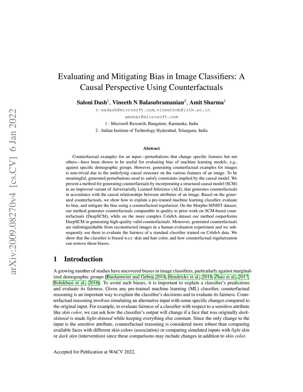 Counterfactual examples for an input -- perturbations that change specific features but not others -- have been shown to be useful for evaluating bias of machine learning models, e.g., against specific demographic groups. However, generating counterfactual examples for images is non-trivial due to the underlying causal structure on the various features of an image. To be meaningful, generated perturbations need to satisfy constraints implied by the causal model. We present a method for generating counterfactuals by incorporating a structural causal model (SCM) in an improved variant of Adversarially Learned Inference (ALI), that generates counterfactuals in accordance with the causal relationships between attributes of an image. Based on the generated counterfactuals, we show how to explain a pre-trained machine learning classifier, evaluate its bias, and mitigate the bias using a counterfactual regularizer. On the Morpho-MNIST dataset, our method generates counterfactuals comparable in quality to prior work on SCM-based counterfactuals (DeepSCM), while on the more complex CelebA dataset our method outperforms DeepSCM in generating high-quality valid counterfactuals. Moreover, generated counterfactuals are indistinguishable from reconstructed images in a human evaluation experiment and we subsequently use them to evaluate the fairness of a standard classifier trained on CelebA data. We show that the classifier is biased w.r.t. skin and hair color, and how counterfactual regularization can remove those biases.